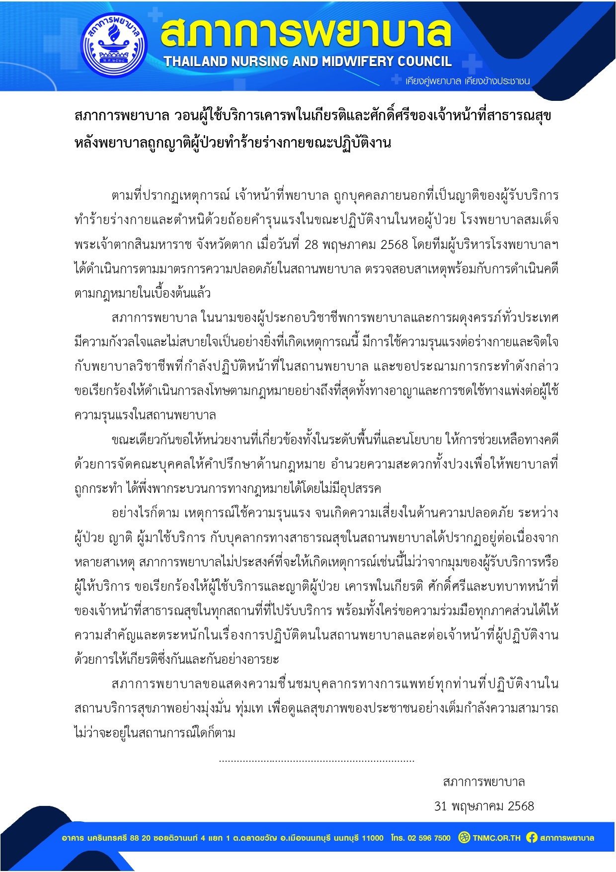 สภาการพยาบาล วอนผู้ใช้บริการเคารพในเกียรติและศักดิ์ศรีของเจ้าหน้าที่สาธารณสุข หลังพยาบาลถูกญาติผู้ป่วยทำร้ายร่างกายขณะปฏิบัติงาน
