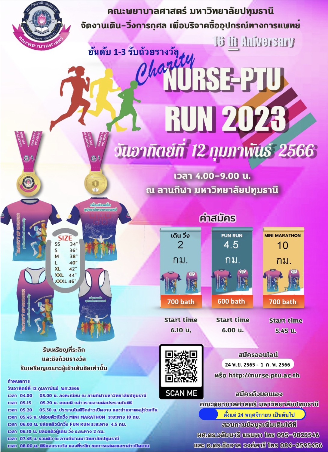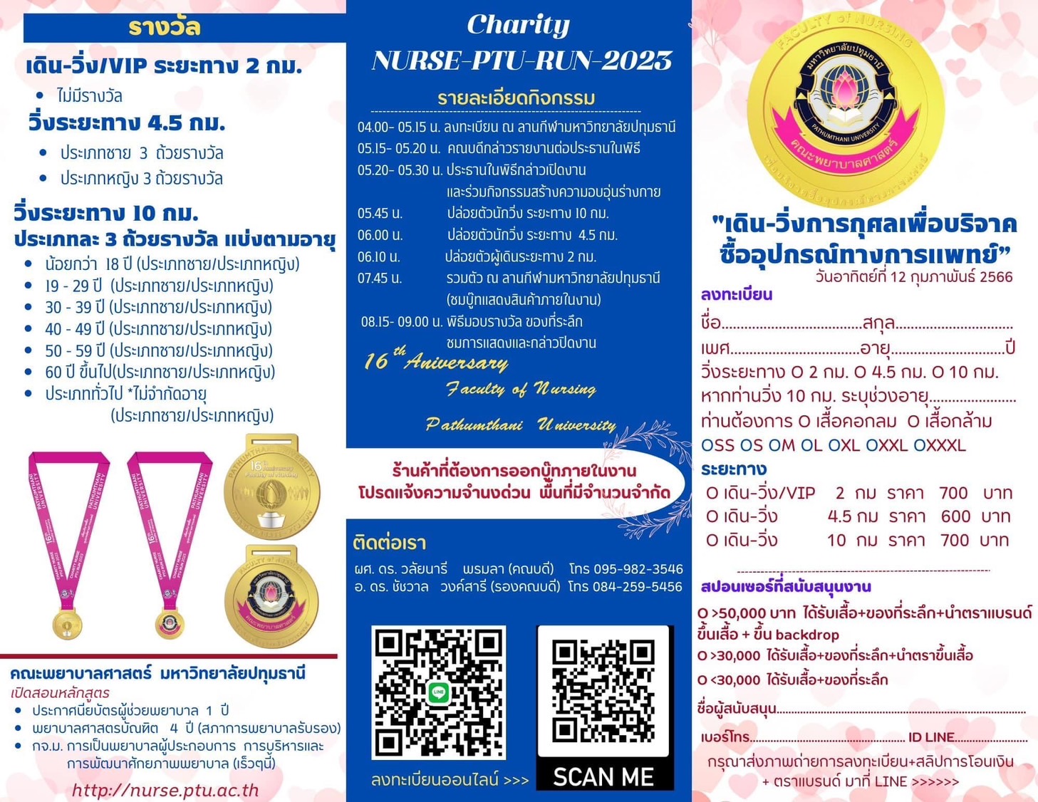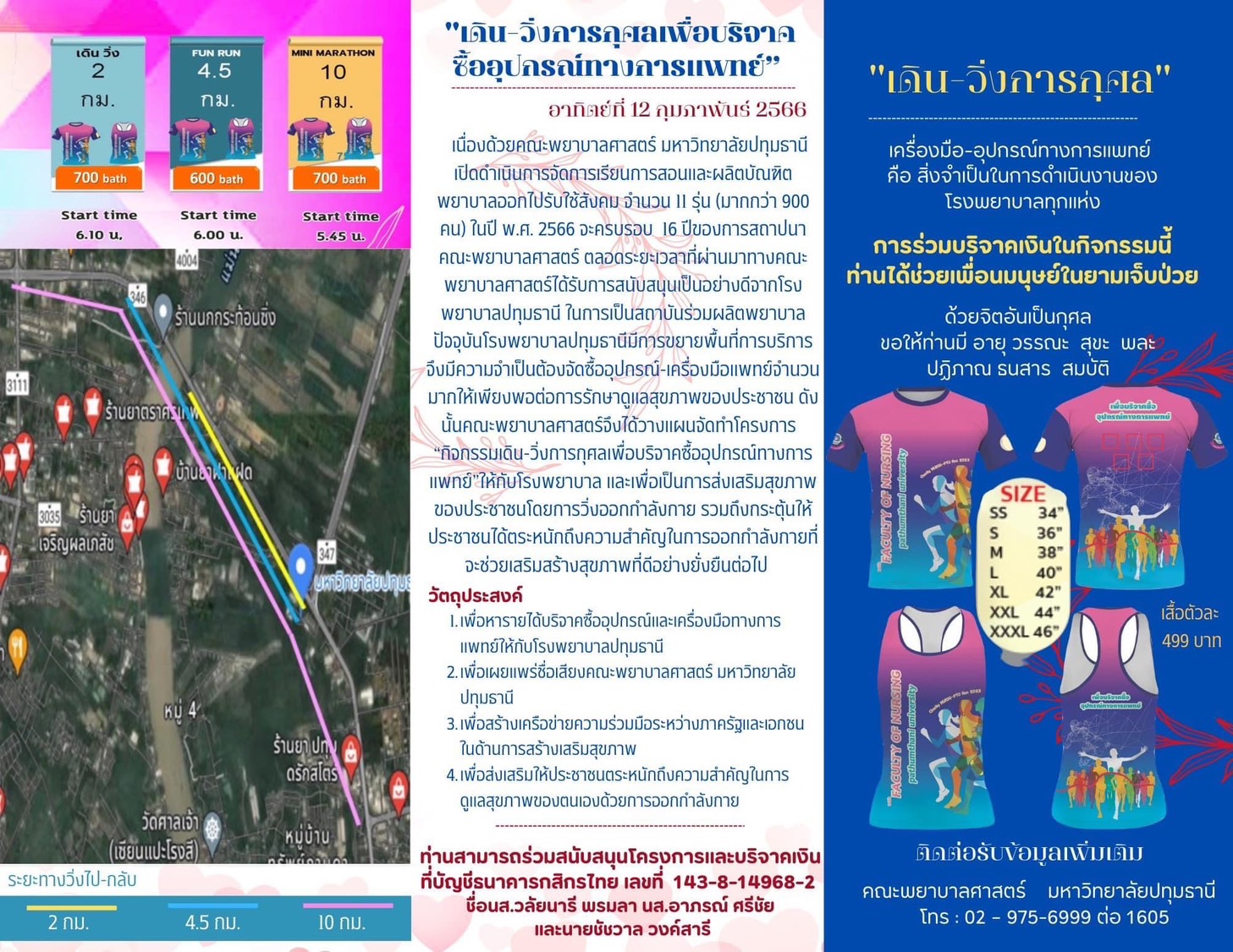 คณะพยาบาลศาสตร์มหาวิทยลัยปทุมธานีเนื่องในวาระครอบรอบ 16ปีของการสถาปนาคณะพยาบาลศาสตร์ ในปี พ.ศ.2566 นี้ จึงขอเชิญชวนท่านร่วมงาน “กิจกรรมเดิน-วิ่งการกุศลเพื่อบริจาคซื้ออุปกรณ์ทางการแพทย์” (Charity Run to buy Medical Supplies and Equipment )” รายได้หลังหักค่าใช้จ่ายมอบซื้ออุปกรณ์ทางการแพทย์ให้กับโรงพยาบาลปทุมธานีกิจกรรมวิ่งจะจัดในอาทิตย์ที่ 12 กุมภาพันธ์ 2566 รวมพลที่ลานกีฬามหาวิทยาลัยปทุมธานี ตั้งเเต่เวลา 04.00-09.00 น. ภายในงานมีกิจกรรมและบู๊ทเเสดงสินค้ามากมาย