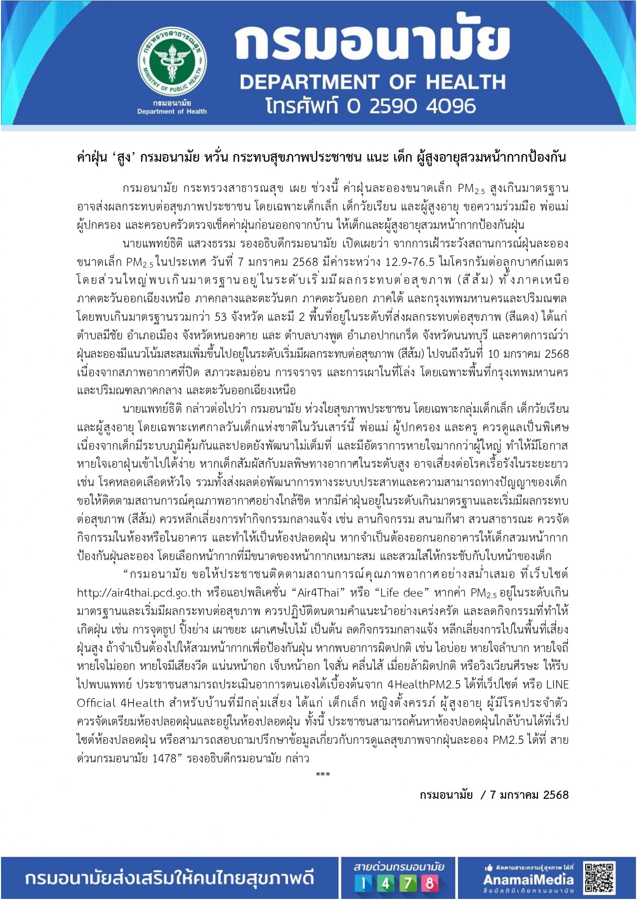 ค่าฝุ่น ‘สูง’ กรมอนามัย หวั่น กระทบสุขภาพประชาชน แนะ เด็ก ผู้สูงอายุสวมหน้ากากป้องกัน