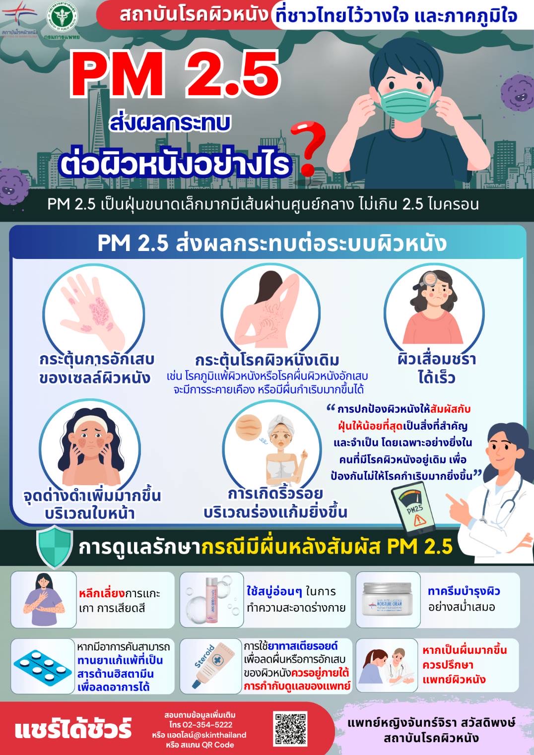 แพทย์หญิงจันทร์จิรา สวัสดิพงษ์ แพทย์ผู้เชี่ยวชาญด้านโรคผิวหนัง สถาบันโรคผิวหนัง กล่าวเพิ่มเติม PM 2.5 ไม่เพียงแค่กระทบต่อระบบทางเดินหายใจแต่ยังเป็นภัยเงียบที่ทำร้ายผิวหนัง เนื่องจากฝุ่นละอองขนาดเล็กสามารถแทรกซึมสู่ผิว ก่อให้เกิดการอักเสบ ผื่นคัน รวมทั้งอาจกระตุ้นให้โรคผิวหนังที่มีอยู่เดิมกำเริบได้ การปกป้องผิวและหลีกเลี่ยงการสัมผัสกับ PM 2.5 โดยตรงจึงเป็นสิ่งสำคัญ ในส่วนของการดูแลรักษาเบื้องต้นกรณีมีผื่นคันหลังการสัมผัสฝุ่น PM 2.5 สามารถทำได้โดยหลีกเลี่ยงการแกะเกา การเสียดสี และการระคายเคืองต่างๆ ซึ่งเป็นสาเหตุที่ทำให้เป็นผื่นมากยิ่งขึ้น ควรใช้สบู่อ่อนๆ ในการ ทำความสะอาดร่างกาย ทาครีมบำรุงผิวอย่างสม่ำเสมอ หากมีอาการคันสามารถทานยาแก้แพ้ที่เป็นสารต้านฮิสตามีน เพื่อลดอาการได้ การซื้อยาทาสเตียรอยด์เพื่อลดผื่นหรือการอักเสบของผิวหนังควรอยู่ภายใต้การกำกับดูแลของแพทย์หรือเภสัชกร อย่างไรก็ตามถ้าผื่นเป็นมากขึ้นควรปรึกษาแพทย์ผู้เชี่ยวชาญเพื่อรับการรักษาที่ถูกต้องและเหมาะสมต่อไป