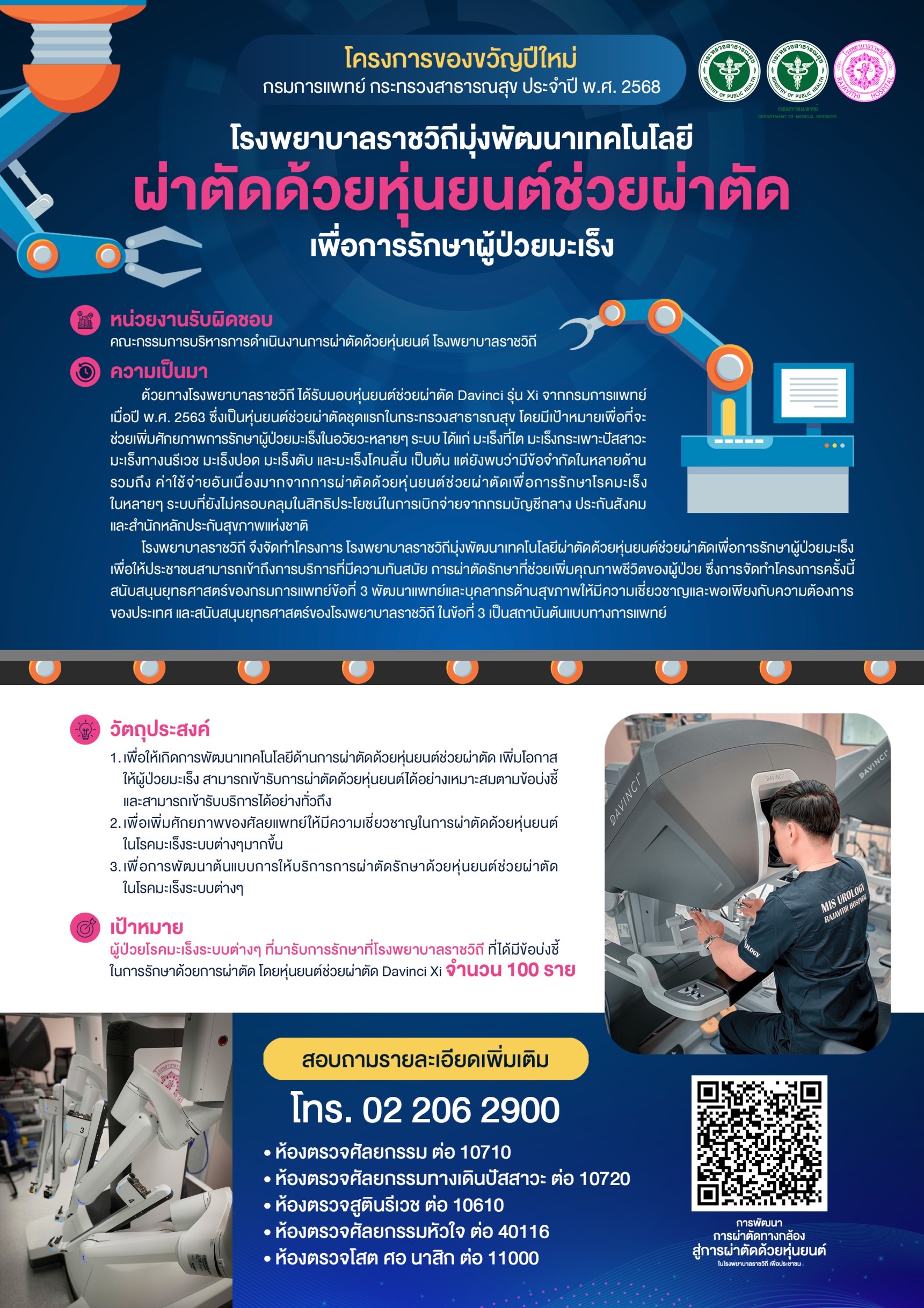 ด้าน นายแพทย์ทวีศิลป์ กล่าวว่า ปัจจุบันการรักษาโรคมะเร็งมีวิวัฒนาการไปมาก ทั้งการผ่าตัดมะเร็งด้วยหุ่นยนต์ช่วยผ่าตัด (Robotic surgery) ที่มีแขนกลเคลื่อนไหวได้ 7 ทิศทาง คล้ายการเคลื่อนไหวของมือศัลยแพทย์ พร้อมเทคโนโลยีภาพ 3 มิติ ทำให้มีความแม่นยำ ภาวะแทรกซ้อนน้อย ขนาดแผลเล็ก ฟื้นตัวเร็ว ปัจจุบันเทคโนโลยีผ่าตัดด้วยหุ่นยนต์สามารถช่วยเพิ่มศักยภาพการรักษาผู้ป่วยมะเร็งในอวัยวะหลายๆ ระบบ ได้แก่ มะเร็งต่อมลูกหมาก มะเร็งไต มะเร็งกระเพาะปัสสาวะ มะเร็งทางนรีเวช มะเร็งปอด มะเร็งตับอ่อน มะเร็งลำไส้ใหญ่ และมะเร็งโคนลิ้น เป็นต้น กรมการแพทย์ กระทรวงสาธารณสุขจึงได้จัดทำโครงการ โรงพยาบาลราชวิถีมุ่งพัฒนาเทคโนโลยีผ่าตัดด้วยหุ่นยนต์ช่วยผ่าตัดเพื่อการรักษาผู้ป่วยมะเร็ง 100 ราย เป็นของขวัญปีใหม่ให้ประชาชน ในปี 2568 เพื่อให้ประชาชนสามารถเข้าถึงการบริการที่มีความทันสมัย ไดัรับการผ่าตัดรักษาที่มีความแม่นยำ ช่วยเพิ่มคุณภาพชีวิตของผู้ป่วย สามารถกลับไปใช้ชีวิตประจำวันได้เร็วขึ้น โดยโครงการดังกล่าวเริ่มตั้งแต่เดือนมีนาคม 2568 – เมษายน 2569 หรือจนกว่าจะครบตามเป้าหมายที่กำหนดไว้ ผู้เข้าร่วมโครงการควรได้รับการตรวจจากแพทย์เฉพาะทางก่อนเข้ารับการบริการ ทั้งนี้ สามารถสอบถามรายละเอียดเพิ่มเติมได้ที่โรงพยาบาลราชวิถี โทร. 0 2206 2900 ต่อ 10710
