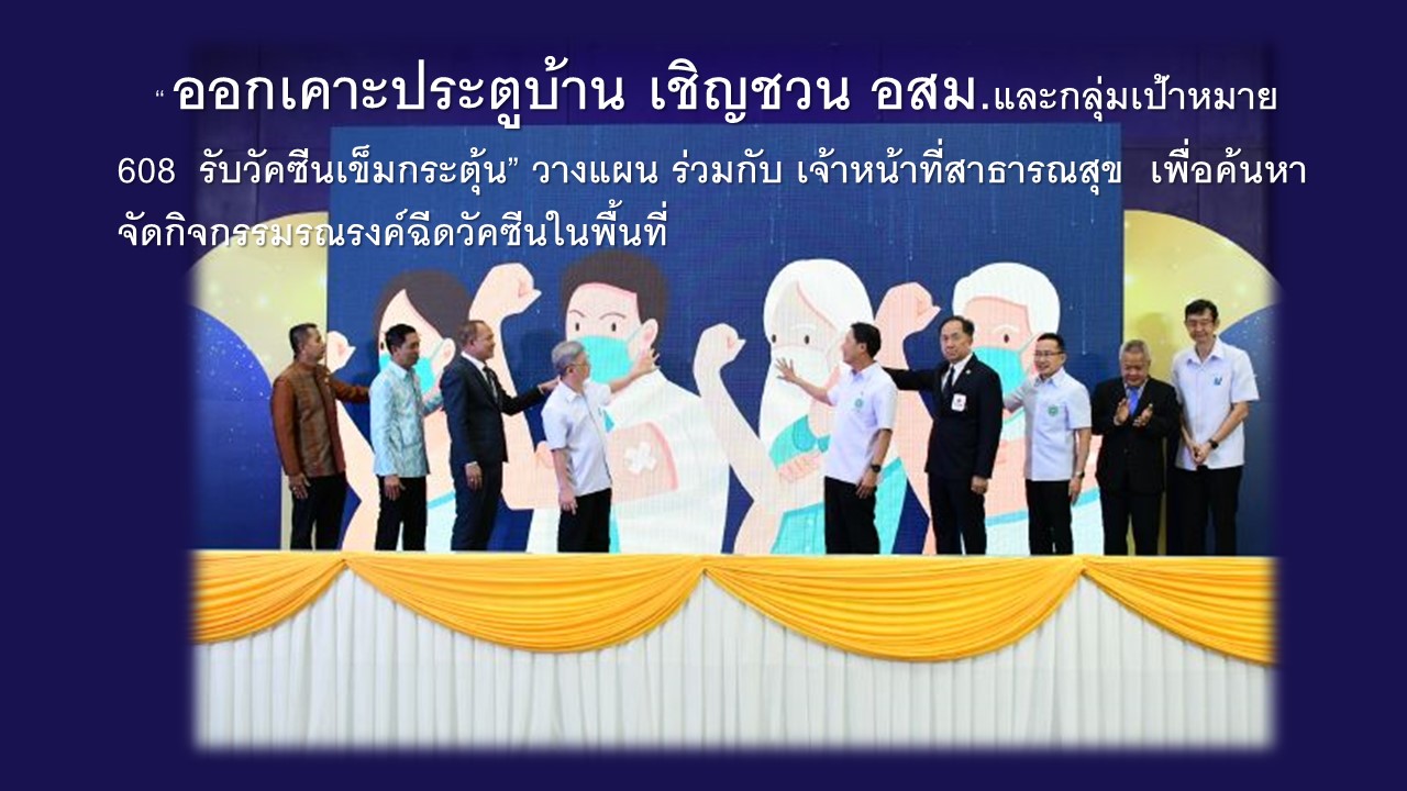 นพ.สุระ กล่าวเพิ่มเติมถึงการร่วมมือของ อสม. ว่า จากนโยบายกระทรวงสาธารณสุข ให้ อสม. เป็นสื่อกลางและเป็นต้นแบบ เร่งการสร้างเสริมภูมิคุ้มกันโรคโควิด 19 ให้มากยิ่งขึ้น แม้ว่าสถานการณ์การระบาดของโรคจะคลี่คลายแล้ว แต่การฉีดวัคซีนเข็มกระตุ้นถือเป็นเครื่องมือสำคัญที่ช่วยลดการป่วยหนักและเสียชีวิตของประชาชน โดยเฉพาะในกลุ่มผู้สูงอายุ ซึ่งที่ผ่านมา อสม.ได้เป็นกลไกสำคัญที่ช่วยสนับสนุนการดำเนินงานมาโดยตลอดและอย่างต่อเนื่อง รวมถึงเป็นแกนนำในการค้นหากลุ่มเป้าหมาย โดย อสม. ได้ใช้กลยุทธ์ “ออกเคาะประตูบ้าน เชิญชวน อสม. และกลุ่มเป้าหมาย 608 ไปรับวัคซีนเข็มกระตุ้น” โดยมีการวางแผนเตรียมพร้อม ร่วมกับ เจ้าหน้าที่สาธารณสุข เพื่อค้นหาและจัดกิจกรรมรณรงค์ฉีดวัคซีนในพื้นที่