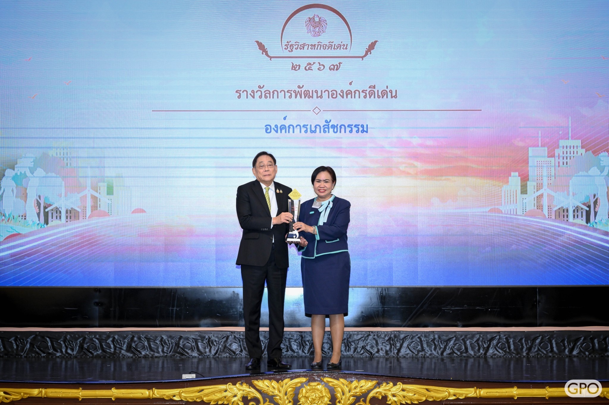 องค์การเภสัชกรรม (อภ.) คว้ารางวัลรัฐวิสาหกิจดีเด่น ประจำปี 2567 ด้านการพัฒนาองค์กรดีเด่น สะท้อนความมุ่งมั่นในการดำเนินงาน ภายใต้วิสัยทัศน์ “องค์กรหลักเพื่อความมั่นคงทางยาและเวชภัณฑ์ของประเทศ ที่ชาวไทยไว้วางใจและภาคภูมิใจ”