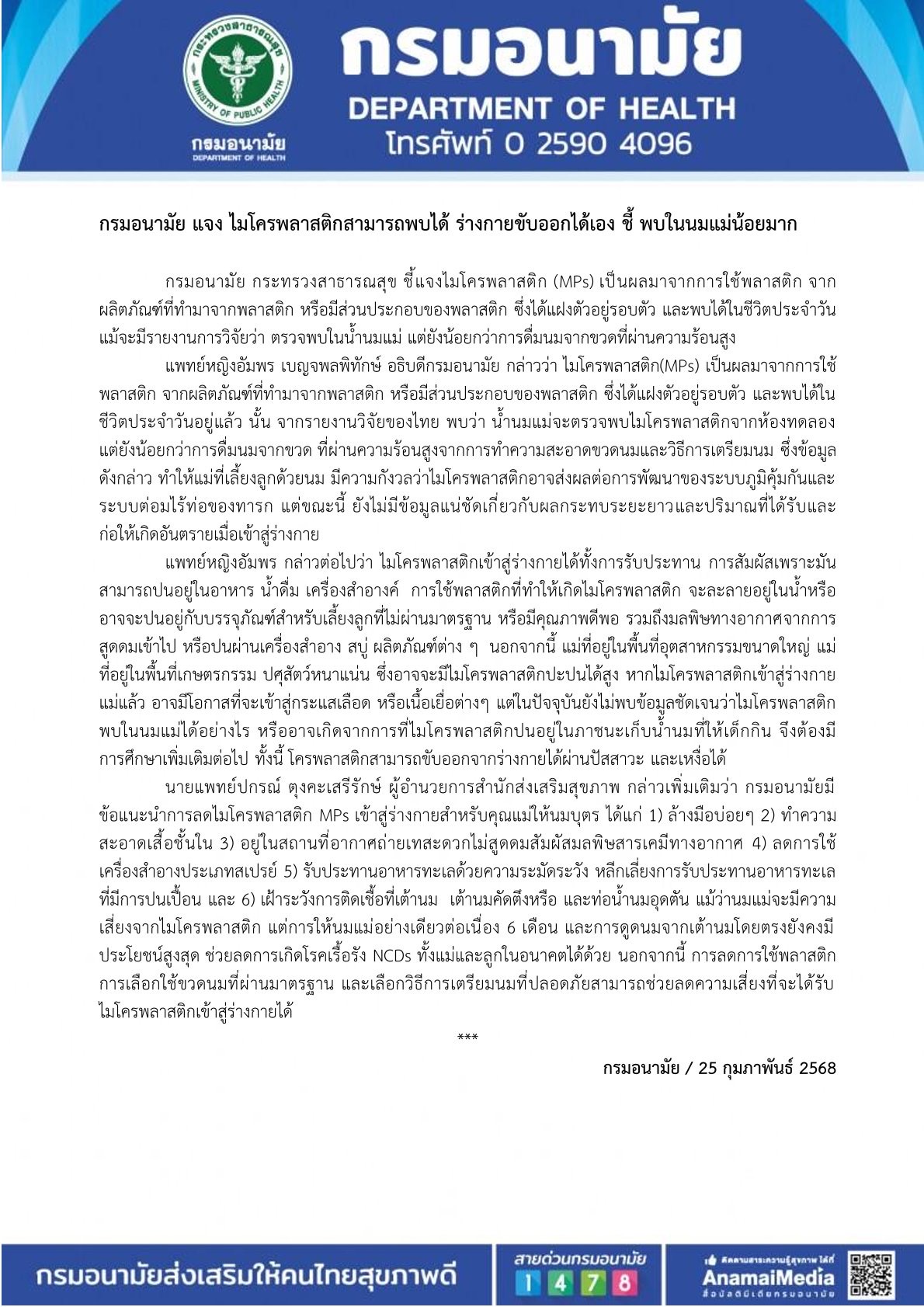 กรมอนามัย แจง ไมโครพลาสติกสามารถพบได้ ร่างกายขับออกได้เอง ชี้ พบในนมแม่น้อยมาก