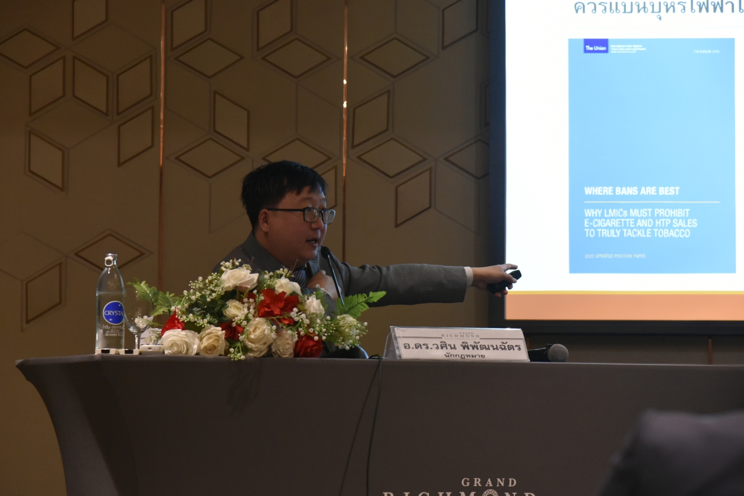 อ.ดร.วศิน พิพัฒนฉัตร นักกฎหมาย และหน่วยวิชาการเครือข่ายนักสาธารณสุขจัดการปัจจัยเสี่ยงสุขภาพ ให้ความเห็นเกี่ยวกับบุหรี่ไฟฟ้าว่า 1) การเลือกสูบบุหรี่ไฟฟ้า และ HTPs ไม่ได้เป็นสิทธิตามกฎหมาย เนื่องจากเป็นผลิตภัณฑ์ทำลายสุขภาพและเป็นหนึ่งในสี่ของสินค้าที่เป็นอันตรายต่อเศรษฐกิจ สังคม และสุขภาพ ที่องค์การสหประชาชาติ ระบุว่าขัดขวางการพัฒนาอย่างยั่งยืน นอกจากนี้ยังมีผลกระทบต่อสุขภาพบุคคลอื่นจากผลบุหรี่ไฟฟ้ามือสอง และมือสาม โดยเฉพาะกลุ่มเสี่ยงคือกลุ่มเด็กและเยาวชน ซึ่งต้องได้รับปกป้องตาม พ.ร.บ.คุ ้มครองเด็ก พ.ศ. 2546 อีกทาง ยิ่งกว่านั้นบุหรี่ไฟฟ้ายังทำลายสิ่งแวดล้อมโลก จึงกระทบสิทธิคนทั้งโลกอีกด้วย 2) การห้ามขายบุหรี่ไฟฟ้าไม่กระทบการท่องเที่ยว เพราะจำนวนของนักท่องเที่ยวมีแนวโน้มเพิ่มขึ้น หลังจากสถานการณ์โควิด 19 และยังคงเพิ่มขึ้นต่อเนื่อง อีกทั้งอัตรานักท่องเที่ยวที่เข้ามาในประเทศไทยก็สูง กว่าประเทศใกล้เคียงที่อนุญาตให้ขายบุหรี่ไฟฟ้าถูกกฎหมายด้วย รวมทั้งไม่กระทบต่อชาวไร่ยาสูบเพราะนิโคตินที่ใช้ในน้ำยาบุหรี่ไฟฟ้าเป็นนิโคตินสังเคราะห์ที่ไม่ได้มาจากใบยาสูบ 3) หากยกเลิกการห้ามการนำเข้าบุหรี่ไฟฟ้าแล้วมาออกกฎหมายควบคุมแทน จะเกิดการระบาดของบุหรี่ไฟฟ้ายิ่งขึ้น ประเทศไทยเคยมีปัญหาเรื่องการออกกฎระเบียบต่างๆ ล่าช้ามากไม่ทันกับการระบาด รวมทั้งการบังคับใช้กฎหมายไม่เข้มงวด ประสบการณ์ของบุหรี่มวนที่ขายได้ถูกกฎหมายก็ยังมีปัญหาเรื่องธุรกิจใต้ดิน ถึงร้อยละ 25 แนวทางแก้ปัญหาคือ การบังคับใช้กฎหมายให้เข้มงวดและต้องเข้าร่วมพิธีสารว่าด้วยการขจัด การค้าผลิตภัณฑ์ยาสูบผิดกฎหมายขององค์การอนามัยโลกซึ่งขณะนี้หน่วยงานของรัฐก็ยังไม่ยอมเข้าร่วม นอกจากนี้การอนุญาตให้บุหรี่ไฟฟ้าถูกกฎหมายก็ไม่ได้ทำให้การยาสูบแห่งประเทศไทยสามารถผลิตขายและ มีรายได้เพิ่ม เพราะเทคโนโลยีเหล่านี้มาจากต่างประเทศที่มีการใช้เทคโนโลยีก้าวหน้ากว่าไทย รวมทั้งการตลาดยุคดิจิตอล