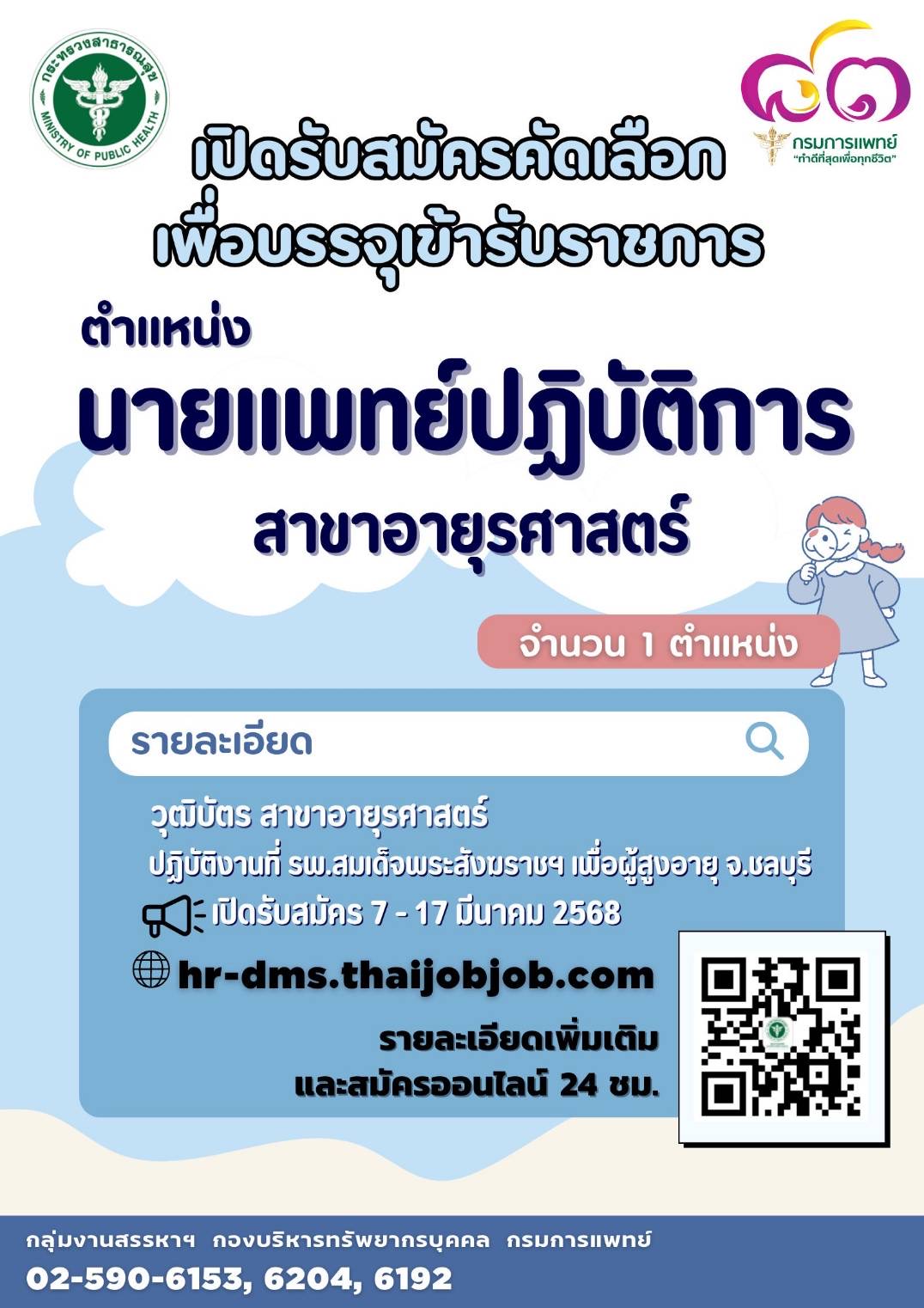 โรงพยาบาลสมเด็จพระสังฆราชญาณสังวรเพื่อผู้สูงอายุ จังหวัดชลบุรี กรมการแพทย์ เปิดรับสมัครคัดเลือก เพื่อบรรจุเข้ารับราชการ ตำแหน่ง นายแพทย์ปฏิบัติการ สาขาอายุรศาสตร์ จำนวน 1 ตำแหน่ง วุฒิบัตร สาขาอายุรศาสตร์ ปฏิบัติงานที่ รพ.สมเด็จพระสังฆราชฯ เพื่อผู้สูงอาย จ.ชลบุรี เปิดรับสมัคร 7 - 17 มีนาคม 2568 สอบถามรายละเอียดเพิ่มเติมโทร. 0 2590 6153, 6204, 6192