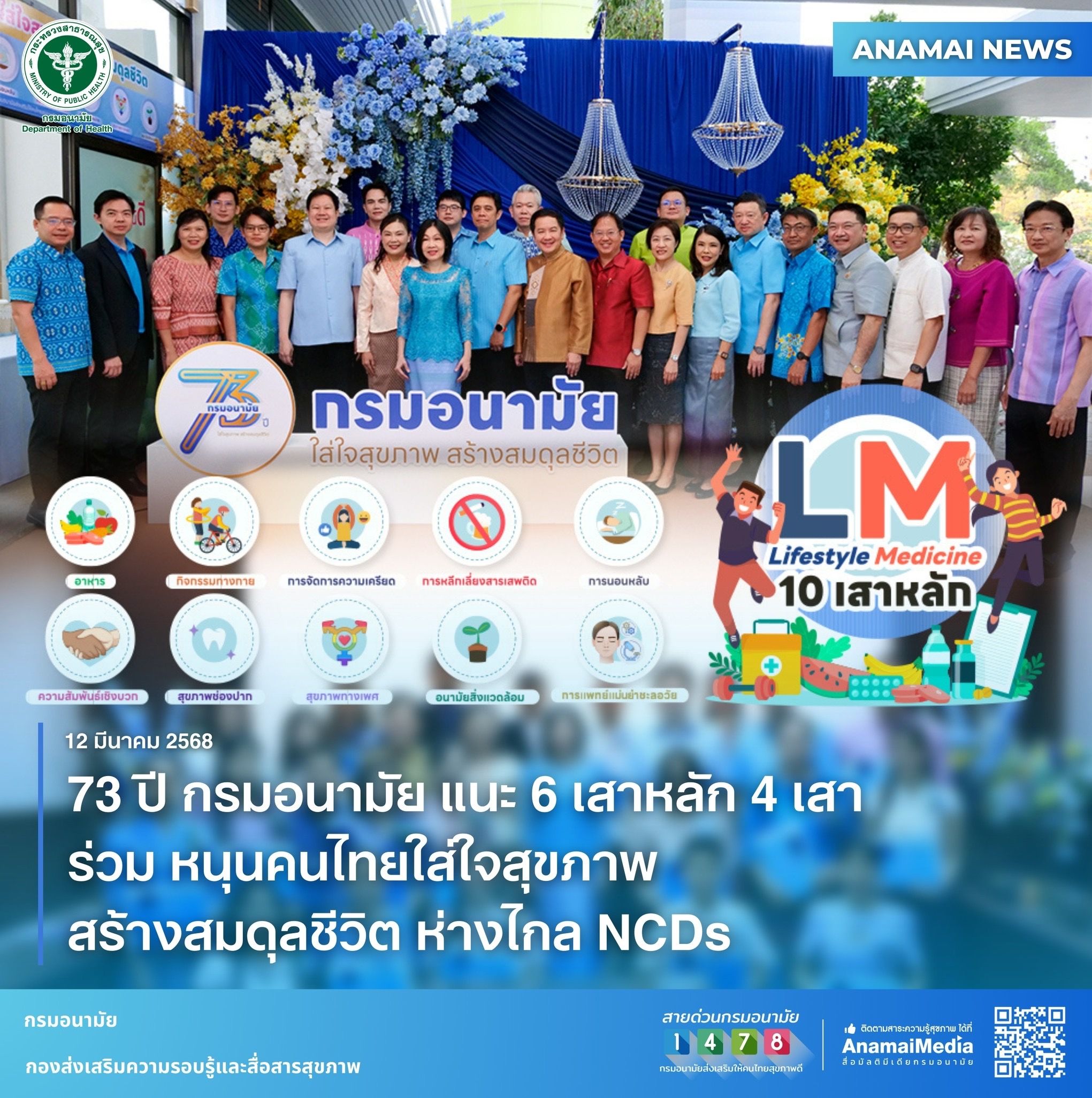 วันนี้ (12 มีนาคม 2568) แพทย์หญิงอัมพร เบญจพลพิทักษ์ อธิบดีกรมอนามัย กล่าวว่า วันที่ 12 มีนาคมของทุกปี เป็นวันคล้ายวันสถาปนากรมอนามัย โดยในปีนี้ กรมอนามัยครบรอบ 73 ปี เดินหน้าตามนโยบายรัฐบาลที่ให้ความสำคัญกับความเป็นอยู่ที่ดีทางด้านสุขภาพของประชาชนทุกกลุ่มวัย โดยนโยบายเด่นในช่วงนี้ก็คือโครงการ 30 บาทรักษาทุกที่ และโครงการลดโรคไม่ติดต่อเรื้อรัง (NCDs) ของกระทรวงสาธารณสุข ซึ่งจากข้อมูลพบว่า ประชาชนไทยป่วยและเสียชีวิตด้วยโรคไม่ติดต่อเรื้อรัง (NCDs) ในแต่ละปี ประมาณ 4 แสนคน ใน ปี 2564 พบว่า ประเทศไทยมีผู้ป่วยโรคเบาหวานมากกว่า 4.8 ล้านคน ผู้ป่วยโรคความดันโลหิตสูง มากกว่า 13 ล้านคน และผู้ป่วยโรคหลอดเลือดหัวใจและสมองมากกว่า 800,000 คน และข้อมูลของสำนักงานสถิติแห่งชาติ ปี 2565 พบว่า อัตราการเสียชีวิตด้วยโรค NCDs ในประเทศไทยสูงถึงร้อยละ 74 ของการเสียชีวิตทั้งหมด และมีแนวโน้มเพิ่มขึ้นขึ้นอย่างต่อเนื่อง