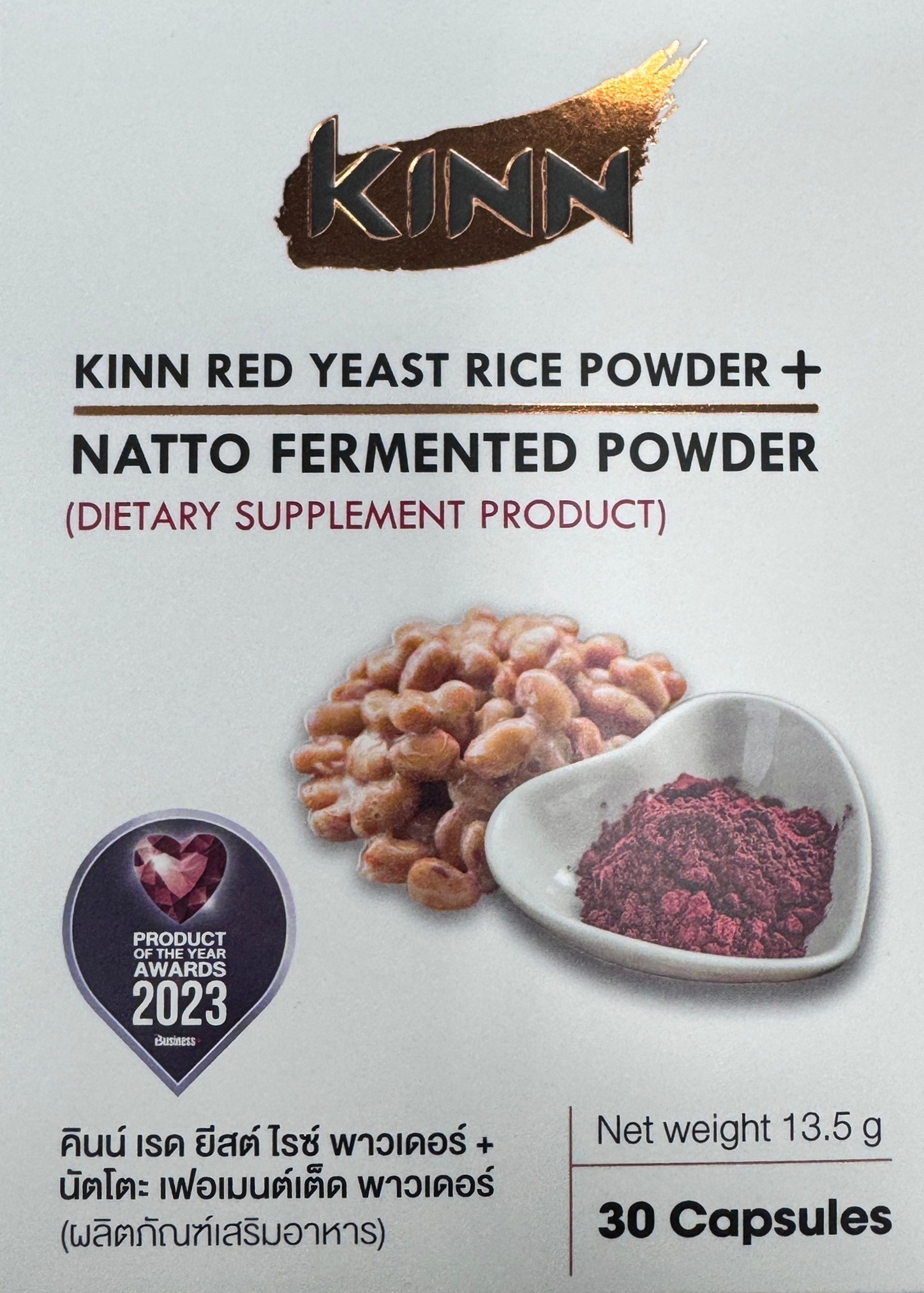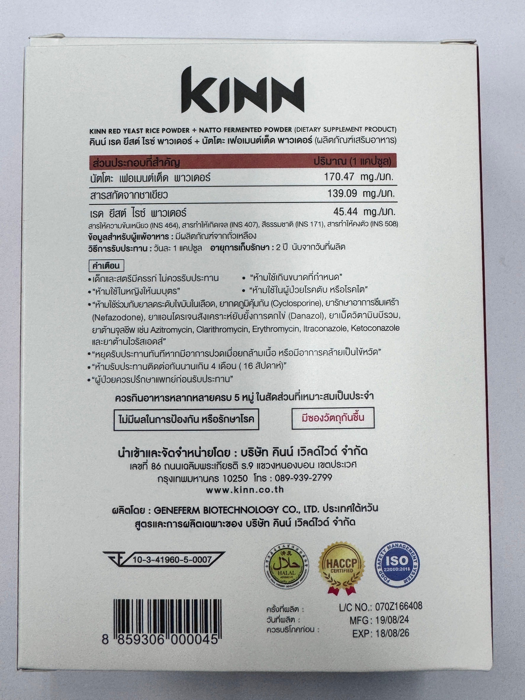 “คินน์ เรด ยีสต์ ไรซ์ พาวเดอร์ + นัตโตะ เฟอเมนต์เต็ด พาวเดอร์ (ผลิตภัณฑ์เสริมอาหาร) เลขสารบบอาหาร 10-3-41960-5-0007 ครั้งที่ผลิต : L/C NO.: 070Z166408 วันที่ผลิต : MFG: 19/08/24 ควรบริโภคก่อน : EXP: 18/08/26 นำเข้าและจัดจำหน่ายโดย : บริษัท คินน์ เวิลด์ไวด์ จำกัด เลขที่ 86 ถนนเฉลิมพระเกียรติ ร.9 แขวงหนองบอน เขตประเวศ กรุงเทพมหานคร 10250 ผลิตโดย GENEFERM BIOTECHNOLOGY CO., LTD. ประเทศใต้หวัน...”