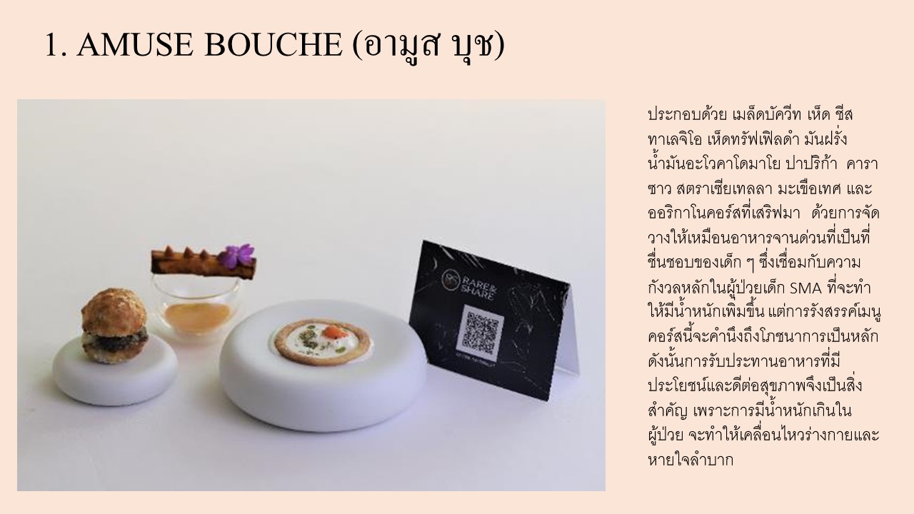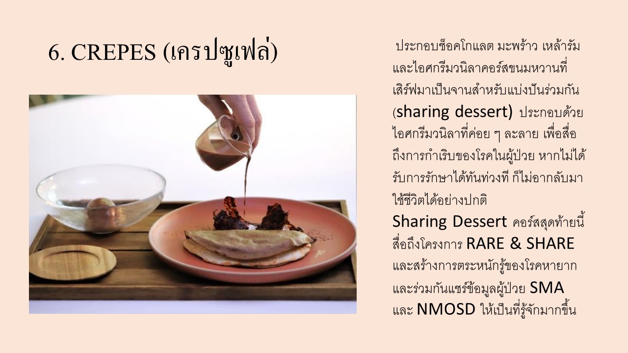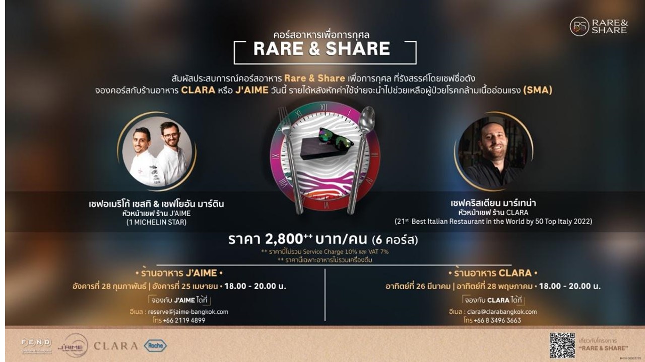 ในครั้งนี้ ทางโครงการ Rare & Share ได้ร่วมมือกับเชฟชื่อดังสองท่าน ได้แก่ เชฟคริสเตียน มาร์เทน่า จากร้านอาหาร CLARA ที่เพิ่งได้รับรางวัล 23rd. Best Italian Restaurant in the World by 50 TOP ITALY 2022 และ เชฟอเมริโก้ เซสทิ จากร้าน J’AIME ที่ได้รับมิชิลิน 1 ดาว เพื่อรังสรรค์คอร์สอาหารสุดพิเศษ ซึ่งอาหารแต่ละคอร์สได้นำเสนอให้ผู้รับประทานได้สัมผ้สถึงประสบการณ์จริงของผู้ป่วยโรคกล้ามเนื้ออ่อนแรง SMA เพื่อเสริมสร้างความตระหนักรู้ของประชาชนคนไทยเกี่ยวกับโรคหายากดังกล่าว รวมถึงการออกแบบอุปกรณ์ ภาชนะที่ใช้บนโต๊ะอาหารเป็นพิเศษ อาทิ ช้อนส้อมยักษ์ที่มีน้ำหนัก เพื่อสะท้อนให้เห็นถึงการหยิบจับสิ่งของในผู้ป่วยที่มีภาวะกล้ามเนื้ออ่อนแรง รวมถึงเมนูอาหารที่ต้องใช้กรรมวิธีในการทำมากกว่า 24 ชั่วโมง เพื่อสะท้อนความทุ่มเทของผู้ดูแลผู้ป่วยที่ให้การดูแลตลอด 24 ชั่วโมงผู้ที่สนใจมีจิตศรัทธา ร่วมทำบุญเพื่อและสมทบเงินเข้าสู่กองทุน มูลนิธิโรคกล้ามเนื้ออ่อนแรง สามารถสนับสนุนผ่านการจองมื้ออาหารพิเศษนี้ ภายใต้โครงการ Rare & Share ซึ่งจะเปิดในเดือนเดือนกุมภาพันธ์ - พฤษภาคม 2566 ตามรอบดังนี้:● วันอังคารที่ 28 กุมภาพันธ์ 2566 (18.00 – 20.00 น.) ณ ร้านอาหาร J’AIME ● วันอาทิตย์ที่ 26 มีนาคม 2566 (18.00 – 20.00 น.) ณ ร้านอาหาร CLARA● วันอังคารที่ 25 เมษายน 2566 (18.00 – 20.00 น.) ณ ร้านอาหาร J’AIME● วันอาทิตย์ที่ 28 พฤษภาคม 2566 (18.00 – 20.00 น.) ณ ร้านอาหาร CLARA