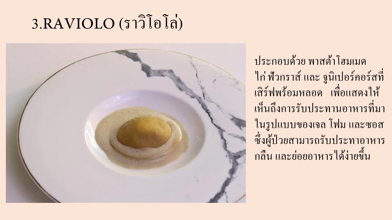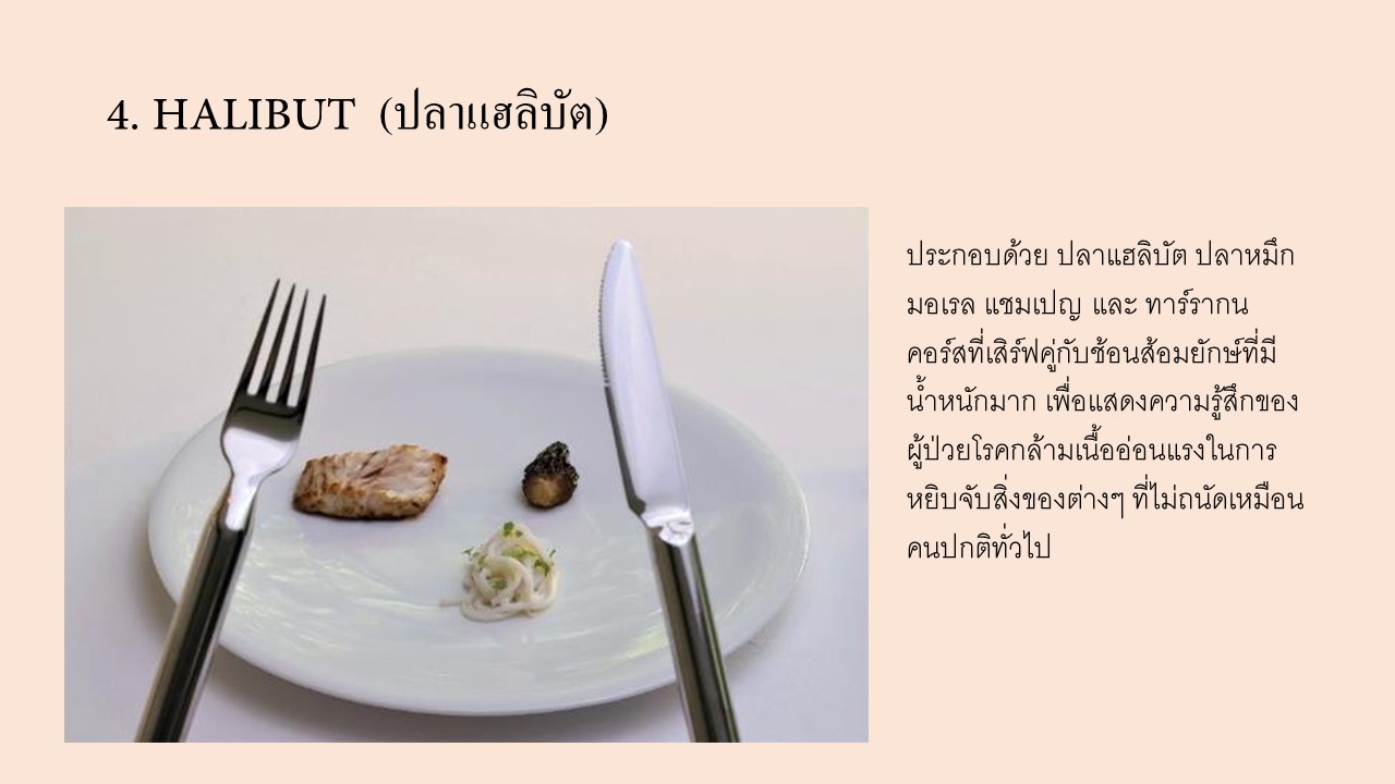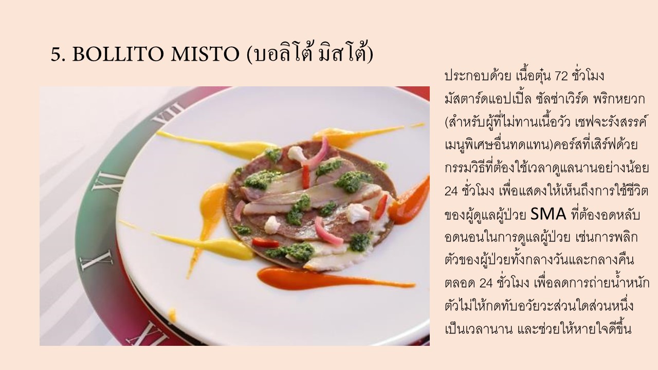 คอร์สอาหารทั้ง 6 ที่รังสรรค์ขึ้น สะท้อนให้เห็นถึงประสบการณ์จริงของผู้ป่วยโรคกล้ามเนื้ออ่อนแรง SMA ได้แก่: