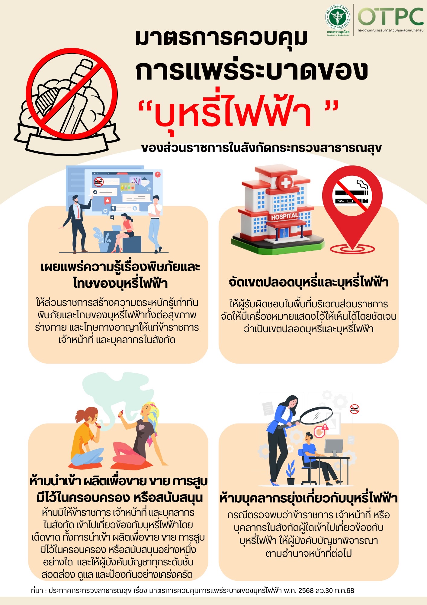 ปัจจุบันปัญหาการแพร่ระบาดของบุหรี่ไฟฟ้ามีความรุนแรงมากขึ้น ส่งผลกระทบต่อสุขภาพของประชาชน โดยเฉพาะอย่างยิ่งในกลุ่มเยาวชน นักเรียน และนักศึกษา กรมควบคุมโรค ในฐานะหน่วยงานสังกัดกระทรวงสาธารณสุข จึงได้เริ่มดำเนินการจัดสถานที่ให้เป็นเขตปลอดบุหรี่และบุหรี่ไฟฟ้าต้นแบบ พร้อมทั้งได้มีข้อสั่งการให้ทุกหน่วยงานดำเนินตามมาตรการฯ ของกระทรวงสาธารณสุขอย่างเคร่งครัด เพื่อป้องกันการเข้าถึงและการใช้บุหรี่ไฟฟ้า เพื่อให้เกิดแนวทางปฏิบัติเดียวกัน ทั้งนี้ หากมีข้อสงสัยเกี่ยวกับกฎหมายควบคุมผลิตภัณฑ์ยาสูบ สอบถามได้ที่ กองงานคณะกรรมการควบคุมผลิตภัณฑ์ยาสูบ โทร. 0 2590 3851