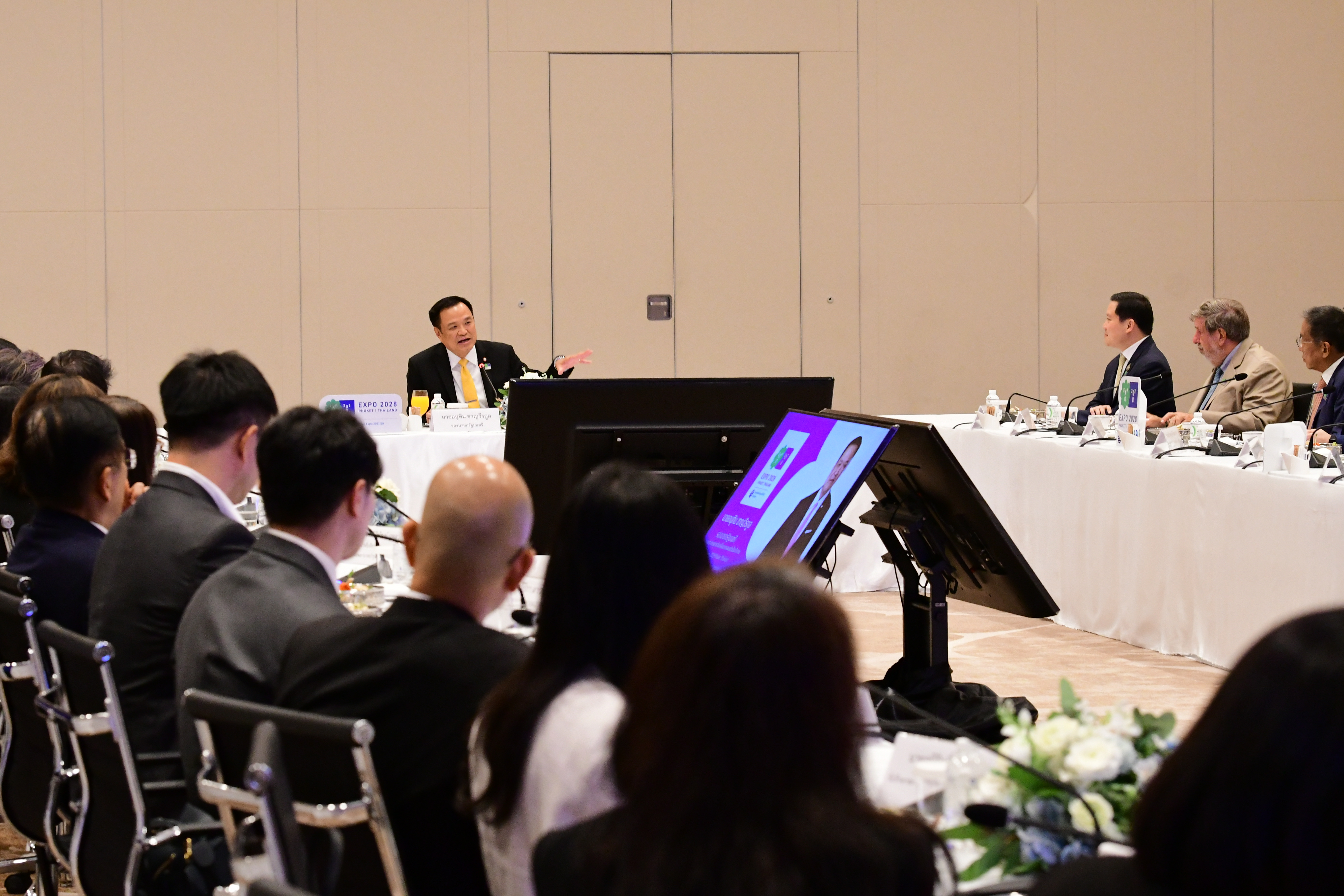 นายอนุทินกล่าวว่า จากการที่ประเทศไทยเป็น 1 ใน 5 ประเทศที่เสนอตัวเป็นเจ้าภาพการจัดงาน Specialised Expo (สหรัฐอเมริกา อาร์เจนตินา เซอร์เบีย สเปน และประเทศไทย) ภายใต้ชื่องาน Expo 2028 Phuket Thailand ขณะนี้เป็นช่วงสุดท้ายก่อนจะพิจารณาในเดือนมิถุนายน 2566 โดยในสัปดาห์นี้จะมีการเข้าร่วมกิจกรรม Symposia เพื่อนำเสนอความคืบหน้าและความพร้อมต่างๆ ในการเป็นเจ้าภาพจัดงาน Specialised Expo แก่คณะกรรมการจากองค์การนิทรรศการนานาชาติ BIE ที่ประเทศฝรั่งเศส สำหรับกระทรวงสาธารณสุขจะนำโดยอธิบดีกรมสนับสนุนบริการสุขภาพ สิ่งสำคัญที่สุดขณะนี้คือความร่วมมือของภาคส่วนต่างๆในประเทศ ที่จะร่วมแสดงออกถึงความพร้อมและความเชื่อมั่นให้กับคณะกรรมการ จึงได้เชิญผู้ประกอบการภาคเอกชนที่มีเครือข่ายทางธุรกิจในระดับโลกมาร่วมประชุม สร้าง Team Thailand ช่วยสนับสนุนการทำงานของภาครัฐในการขอเสียงสนับสนุนจากประเทศสมาชิกต่างๆ 171 ประเทศ รวมถึงเครือข่ายธุรกิจในประเทศร่วมประชาสัมพันธ์ เพื่อให้ประเทศไทยได้เป็นเจ้าภาพจัดงาน Expo 2028 Phuket Thailand