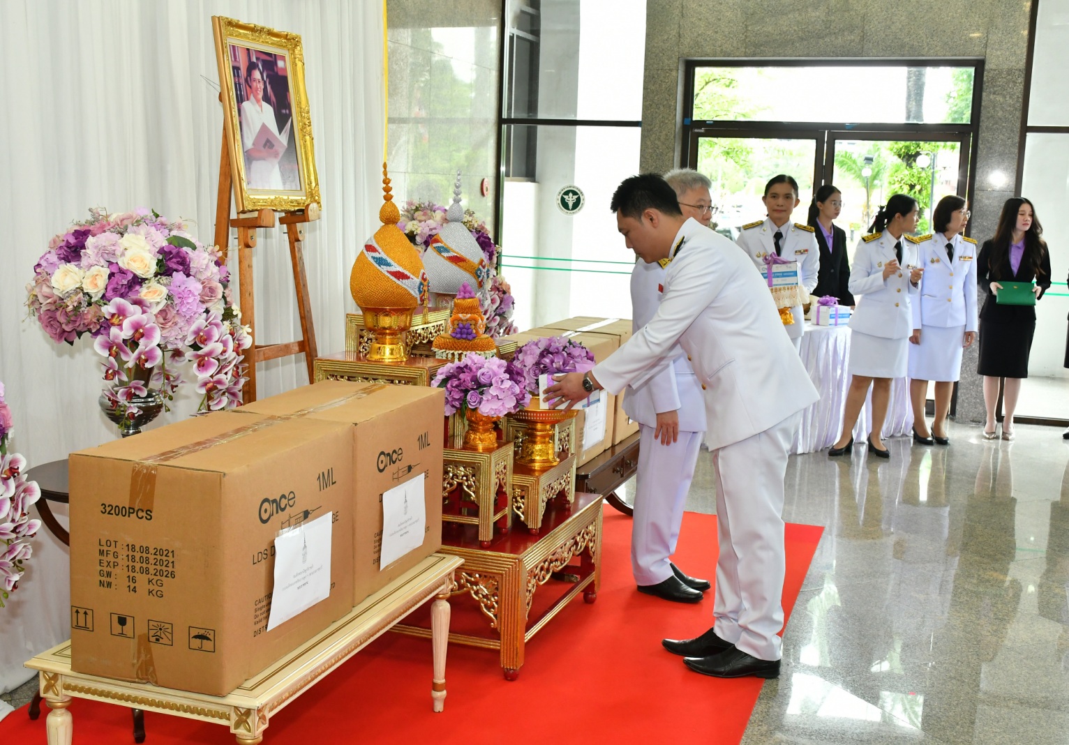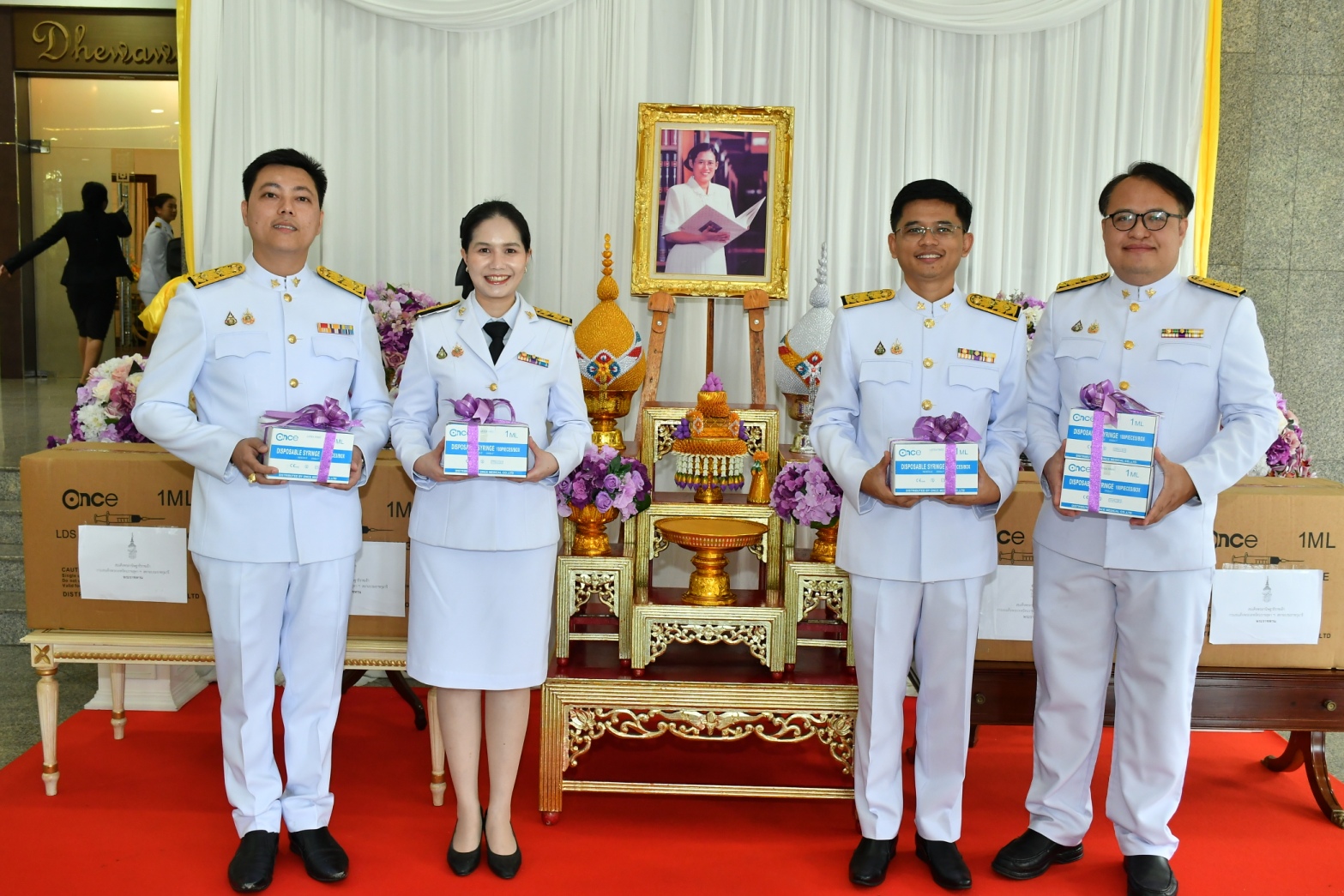 นพ.โอภาส กล่าวว่า กระทรวงสาธารณสุข น้อมสำนึกในพระมหากรุณาธิคุณของสมเด็จพระกนิษฐาธิราชเจ้า กรมสมเด็จพระเทพรัตนราชสุดา ฯ สยามบรมราชกุมารี ที่ทรงพระกรุณาโปรดเกล้าโปรดกระหม่อม พระราชทานกระบอกพร้อมเข็มฉีดยา ขนาด 1 มิลลิลิตร จำนวน 1,001,600 เข็ม แก่โรงพยาบาลในสังกัดกระทรวงสาธารณสุข สำหรับใช้ประโยชน์ในทางการแพทย์ โดยกระทรวงจะกระจายไปยังโรงพยาบาลสมเด็จพระยุพราช 21 แห่ง โรงพยาบาลชุมชนเฉลิมพระเกียรติ 80 พรรษา 10 แห่ง โรงพยาบาลเทพรัตนเวชชานุกูลเฉลิมพระเกียรติ 60 พรรษา และโรงพยาบาลชัยพัฒน์ จังหวัดพังงา 5 แห่ง รวมทั้งโรงพยาบาลในสังกัดสำนักงานสาธารณสุขจังหวัดที่มีพื้นที่การระบาดของโรคที่ป้องกันได้ด้วยวัคซีน 17 จังหวัด ได้แก่ เชียงราย เชียงใหม่ แม่ฮ่องสอน ตาก กาญจนบุรี ราชบุรี เพชรบุรี ประจวบคีรีขันธ์ ชุมพร ระนอง อุบลราชธานี ศรีสะเกษ บุรีรัมย์ สุรินทร์ สระแก้ว จันทบุรี และตราด
