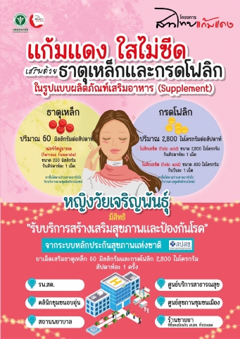 “นอกจากนี้ กรมอนามัยยังได้เร่งหารือกับสำนักงานหลักประกันสุขภาพแห่งชาติ เพื่อปรับแนวทางการให้บริการและเพิ่มการเข้าถึงชุดสิทธิประโยชน์สำหรับหญิงวัยเจริญพันธุ์ ให้มีการจ่ายยาเม็ดเสริมธาตุเหล็กและกรดโฟลิกแก่หญิงวัยเจริญพันธุ์ อายุ 13 ถึง 45 ปี ในรายการ Fee schedule เพื่อให้หญิงวัยเจริญพันธุ์มีสุขภาพดีมากขึ้น เพราะเป็นวัยที่มีประสิทธิภาพในการทำงานและมีโอกาสตั้งครรภ์คุณภาพสูงการมีสุขภาพร่างกายที่ดี ไม่ซีด ไม่ป่วยง่าย จึงเป็นสิ่งสำคัญ ซึ่งนอกจากยาเม็ดเสริมธาตุเหล็กและกรดโฟลิก กรมอนามัยยังส่งเสริมให้หญิงไทยกินผัก ผลไม้ และเลือกแหล่งอาหารที่มีธาตุเหล็กสูง เช่น เนื้อสัตว์ ตับ เลือด จะช่วยลดปัญหาภาวะโลหิตจางจากการขาดธาตุเหล็ก และลดความเสี่ยงของทารกพิการแต่กำเนิดซึ่งจะนำไปสู่การตั้งครรภ์อย่างมีคุณภาพ เป็นสาวไทยแก้มแดงของไทยต่อไป” รองอธิบดีกรมอนามัย กล่าว