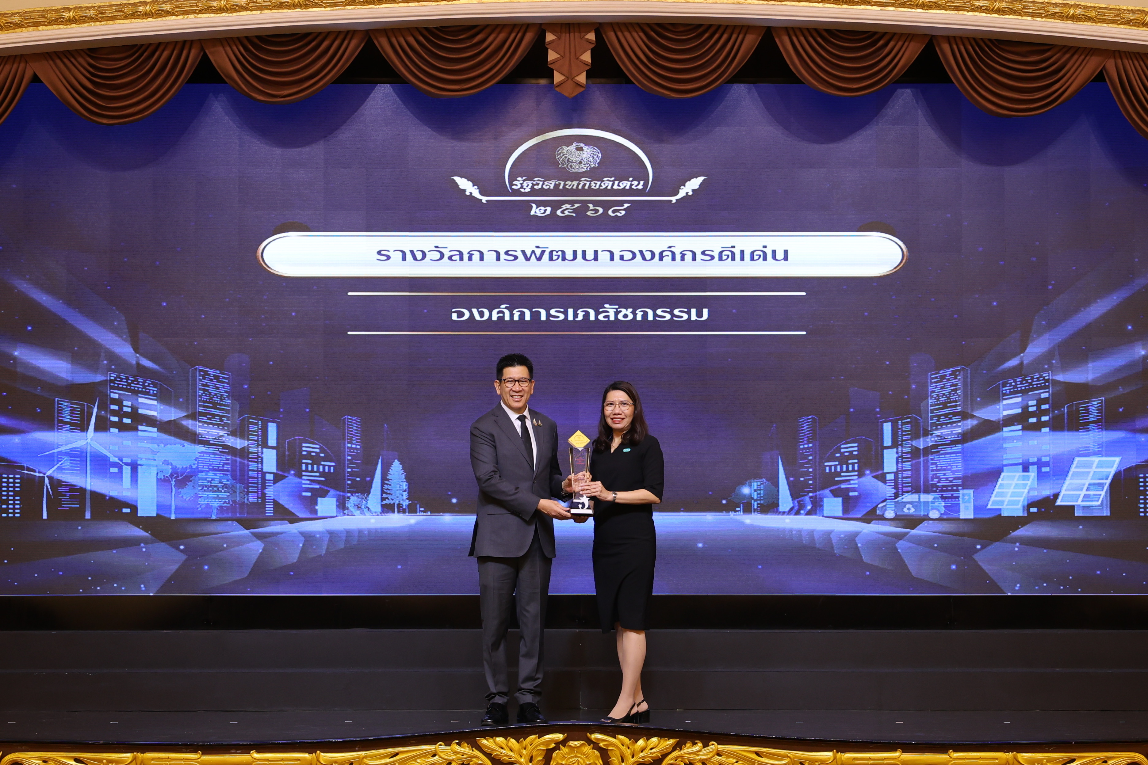 นายเอกนิติ นิติฑัณฑ์ประภาศ รองนายกรัฐมนตรีและรัฐมนตรีว่าการกระทรวงการคลัง เป็นประธานในพิธีมอบรางวัลรัฐวิสาหกิจดีเด่น (SOE Awards) ประจำปี 2568 ซึ่งสำนักงานคณะกรรมการนโยบายรัฐวิสาหกิจ (สคร.) จัดขึ้น โดยมี ดร.ภญ.พรทิพย์ วิรัชวงศ์ รองผู้อำนวยการองค์การเภสัชกรรม เป็นผู้แทนเข้ารับมอบรางวัล ณ ตึกสันติไมตรี ทำเนียบรัฐบาล