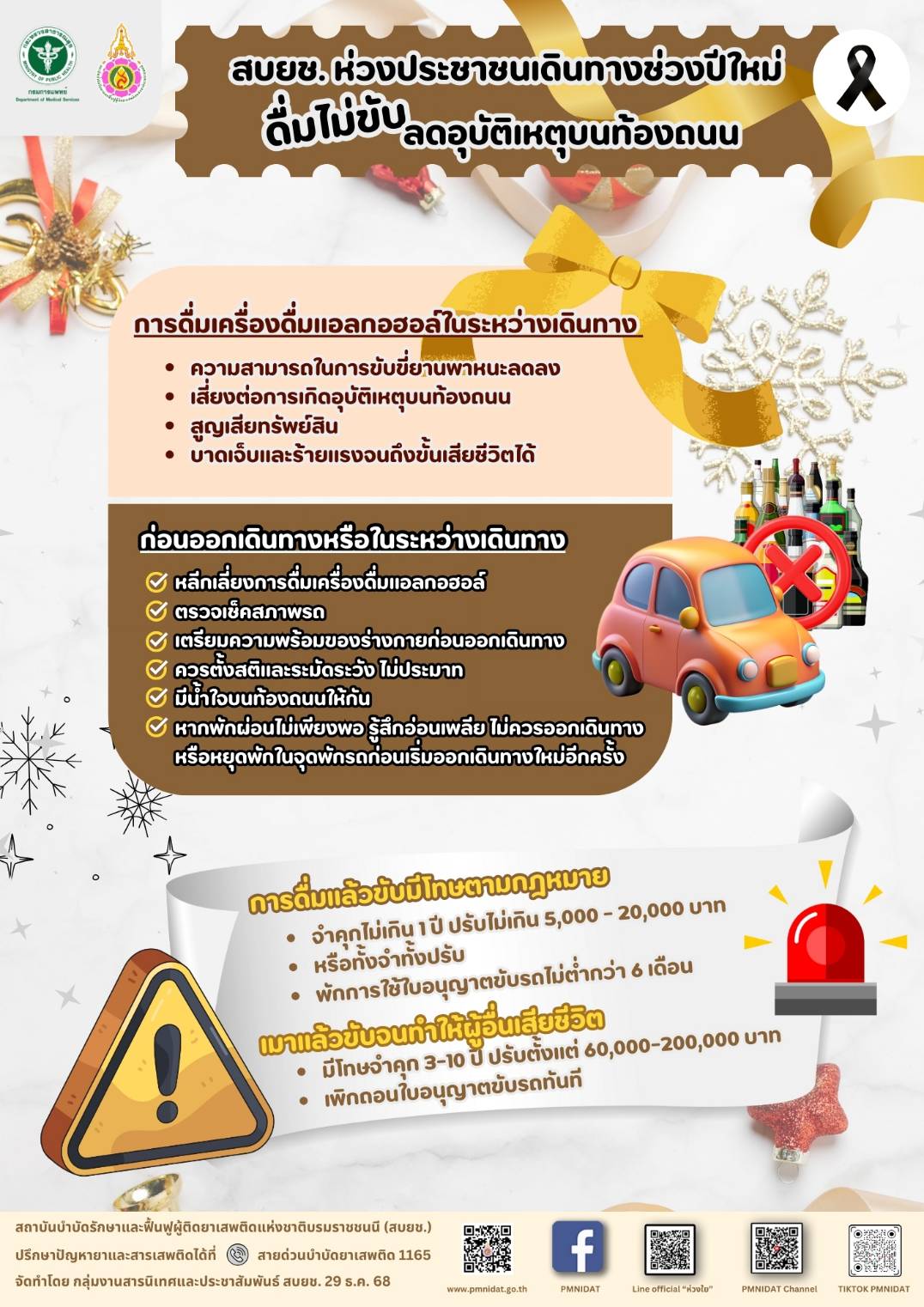 นายแพทย์สกานต์ บุนนาค รองอธิบดีกรมการแพทย์ กล่าวว่า ช่วงเทศกาลปีใหม่ เป็นช่วงเวลาที่ดีที่ประชาชนหลายๆ คนเลือกที่จะเดินทางกลับ ภูมิลำเนาเดิม หรือเดินทางไปท่องเที่ยวตามสถานที่ท่องเที่ยวต่างๆ และคงไม่พลาดที่จะสังสรรค์กับเพื่อนหรือครอบครัว ซึ่งอาจจะมีการดื่มเครื่องดื่มแอลกอฮอล์ด้วย แต่อย่างไรก็ตามไม่ควรดื่มเครื่องดื่มแอลกอฮอล์ในระหว่างเดินทาง เพราะจะทำให้ความสามารถในการขับขี่ยานพาหนะลดลง อาจเป็นสาเหตุของการเกิดอุบัติเหตุบนท้องถนน สูญเสียทรัพย์สิน บาดเจ็บและอาจร้ายแรงจนถึงขั้นเสียชีวิตได้ ทั้งนี้การดื่มแล้วขับมีโทษตามกฎหมาย โดยจำคุกไม่เกิน 1 ปี ปรับไม่เกิน 5,000 - 20,000 บาท หรือทั้งจำทั้งปรับ พักการใช้ใบอนุญาตขับรถไม่ต่ำกว่า 6 เดือน แต่หากเมาแล้วขับจนทำให้ผู้อื่นเสียชีวิต จะมีโทษจำคุก 3-10 ปี ปรับตั้งแต่ 60,000-200,000 บาท และเพิกถอนใบอนุญาตขับรถทันที