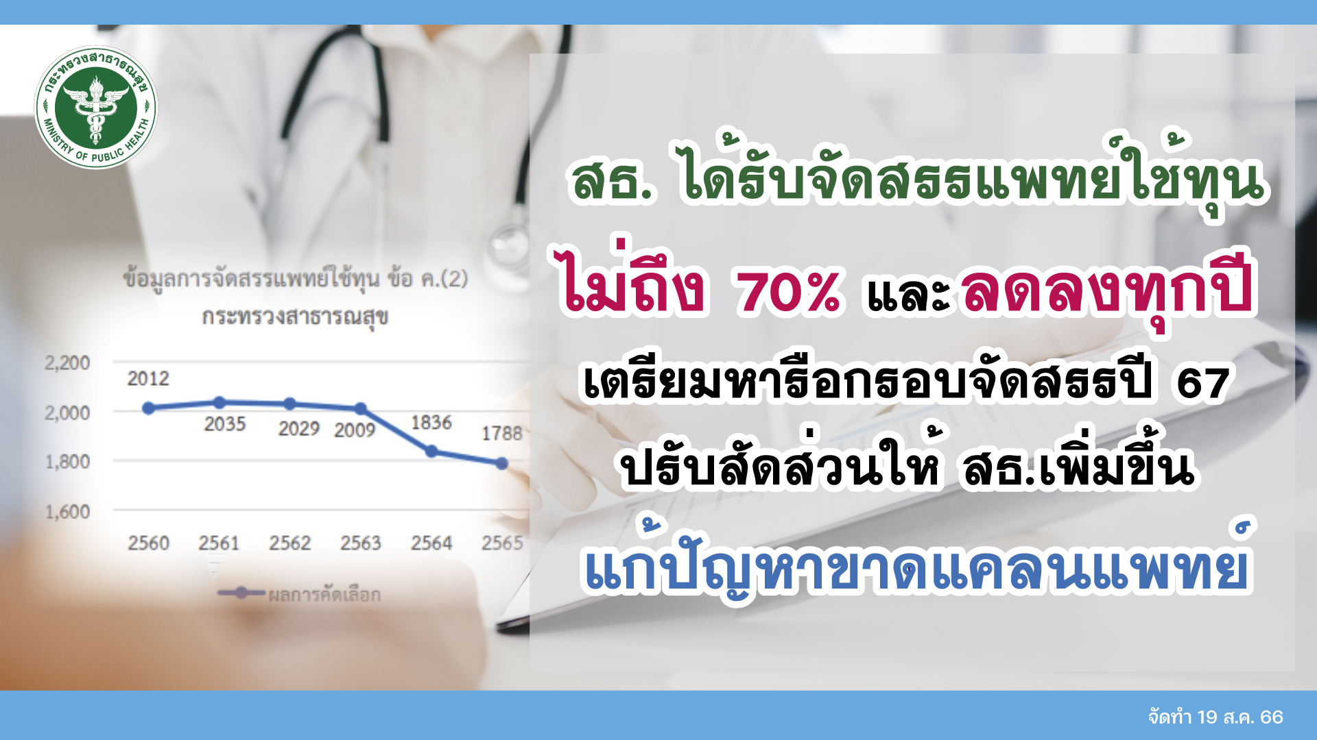 กระทรวงสาธารณสุข เผย ได้รับจัดสรรแพทย์ใช้ทุนไม่ถึง 70% และมีจำนวนลดลงทุกปี เตรียมหารือกรอบจัดสรรแพทย์ใช้ทุนปี 2567 เบื้องต้นหน่วยงานเกี่ยวข้องเห็นตรงกันปรับสัดส่วนให้กระทรวงฯ เพิ่มขึ้น คาดในปี 2567 มีแพทย์จบประมาณ 2,800 คน จะจัดสรรให้ประมาณ 2,000 คน เพิ่มขึ้นจากปีก่อนราว 200 คน ช่วยเติมแพทย์เข้าระบบและบรรเทาการขาดแคลนในบางพื้นที่