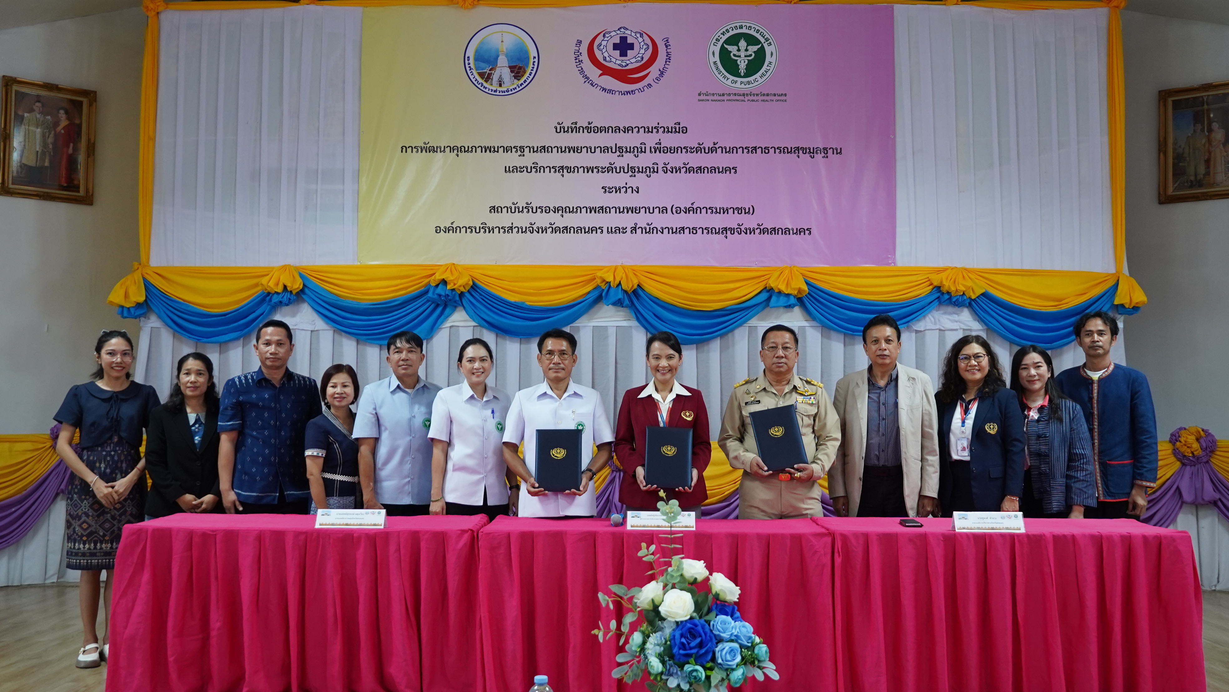 วันที่ 24 สิงหาคม 2566 ณ ห้องประชุมศูนย์บริหารจัดการน้ำ องค์การบริหารส่วนจังหวัดสกลนคร จังหวัดสกลนคร สถาบันรับรองคุณภาพสถานพยาบาล (องค์การมหาชน) (สรพ.) ร่วมกับ องค์การบริหารส่วนจังหวัดสกลนคร (อบจ.) และสำนักงานสาธารณสุขจังหวัดสกลนคร (สสจ.) ร่วมลงนามบันทึกข้อตกลงความร่วมมือ (MOU) การพัฒนาคุณภาพมาตรฐานสถานพยาบาลปฐมภูมิ เพื่อยกระดับด้านการสาธารณสุขมูลฐาน และ บริการสุขภาพระดับปฐมภูมิ นำร่องในโรงพยาบาลส่งเสริมสุขภาพตำบล หลังมีการเปลี่ยนผ่านถ่ายโอนสู่องค์การปกครองส่วนท้องถิ่น เพื่อสร้างมาตรฐานคุณภาพและความปลอดภัยในการบริการสุขภาพ โดยนำร่องโรงพยาบาลส่งเสริมสุขภาพตำบล (รพ.สต.) ต้นแบบ 6 แห่ง ประกอบด้วย รพ.สต.บ้านแสนพัน, รพ.สต.บ้านนาเพียงใหม่, รพ.สต.บ้านหนองบัวสร้าง, รพ.สต.บ้านห้วยกอก, รพ.สต.บ้านบอน และ รพ.สต.โพธิไพศาล