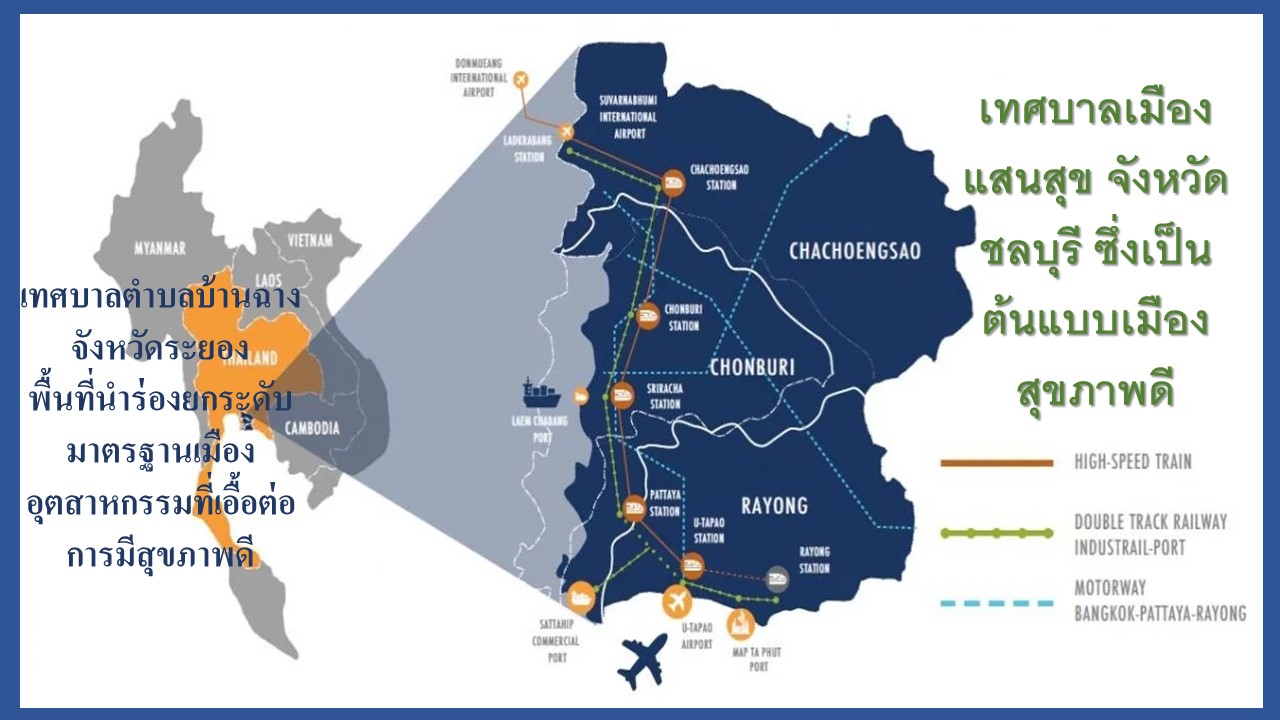 นอกจากนี้ กรมอนามัยได้มอบรางวัลเชิดชูเกียรติแก่เทศบาลเมืองแสนสุข จังหวัดชลบุรี ซึ่งเป็นต้นแบบเมืองสุขภาพดี ในการยกระดับงานอนามัยสิ่งแวดล้อมให้ได้มาตรฐาน รองรับการใช้ชีวิตตามแนววิถีใหม่ (New Normal) ทั้งในมิติสถานประกอบการ มิติชุมชน และมิติการพัฒนาคุณภาพระบบบริการอนามัยสิ่งแวดล้อม เพื่อให้เป็นต้นแบบเมืองสุขภาพดี รวมทั้งได้มอบโล่เชิดชูเกียรติแก่เทศบาลตำบลบ้านฉาง จังหวัดระยอง ซึ่งเป็นพื้นที่นำร่องยกระดับมาตรฐานเมืองอุตสาหกรรมที่เอื้อต่อการมีสุขภาพดีอีกด้วย จากการขับเคลื่อนโครงการดังกล่าว