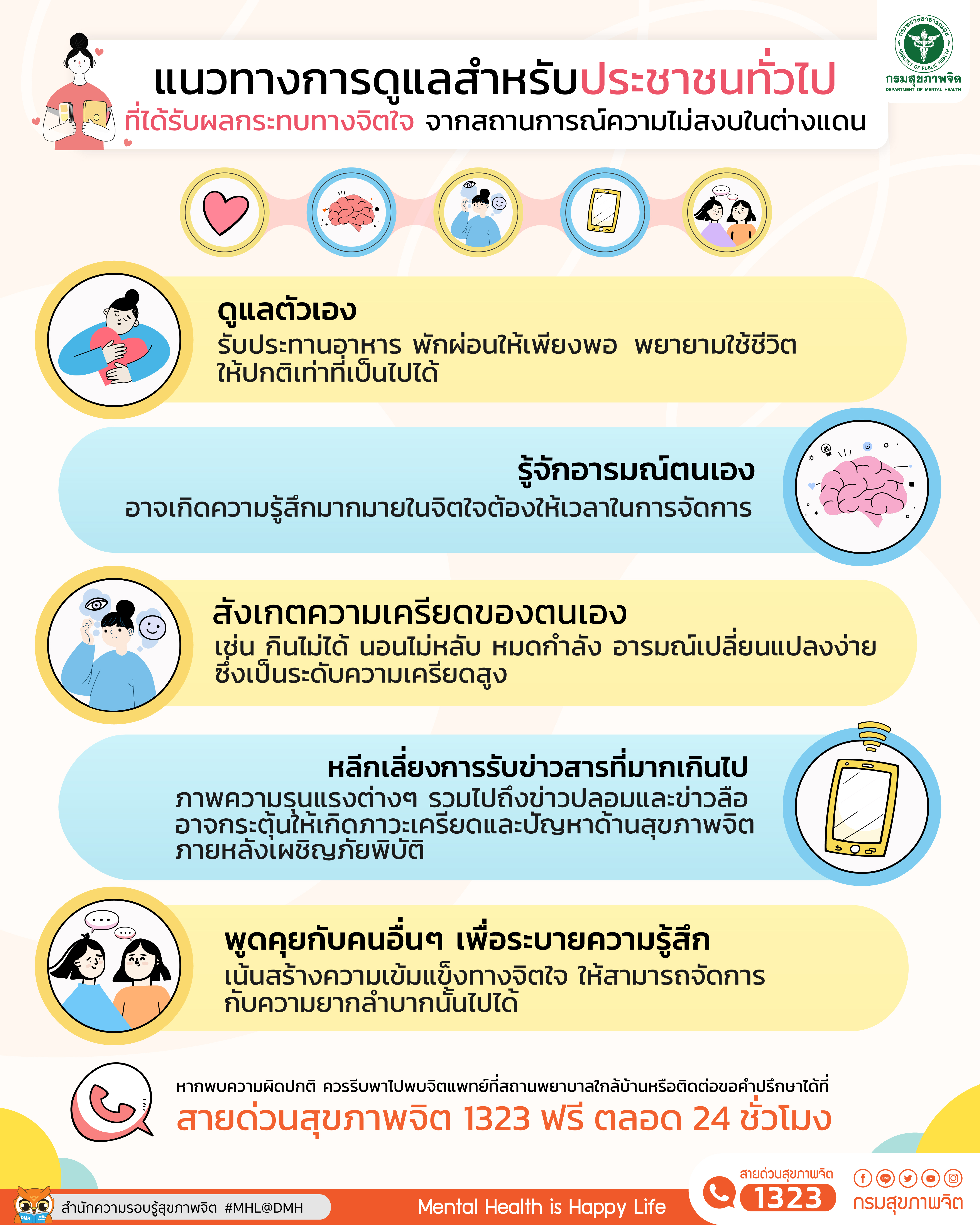 ทั้งนี้หากประชาชนท่านใดพบความผิดปกติของตนเองหรือคนใกล้ชิด ควรรีบปรึกษาผู้เชี่ยวชาญด้านสุขภาพจิตหรือจิตแพทย์ ณ สถานพยาบาลใกล้บ้านเพื่อขอรับคำปรึกษาและการบำบัดรักษา หรือโทรปรึกษาสายด่วนสุขภาพจิต 1323 ได้ฟรีตลอด 24 ชั่วโมง นอกจากนี้ กรมสุขภาพจิตยังได้เปิดไลน์ “สายด่วนสุขภาพจิต 1323 เพิ่มเติม สำหรับคนไทยในอิสราเอล” เพื่อช่วยเหลือคนไทยที่กำลังอาศัยอยู่ในประเทศอิสราเอลและได้รับผลกระทบด้านจิตใจ ให้สามารถเข้ามาลงทะเบียนขอรับความช่วยเหลือด้านสุขภาพจิต โดยจะมีผู้เชี่ยวชาญด้านสุขภาพจิตติดต่อกลับไปเพื่อให้ความช่วยเหลืออีกด้วย