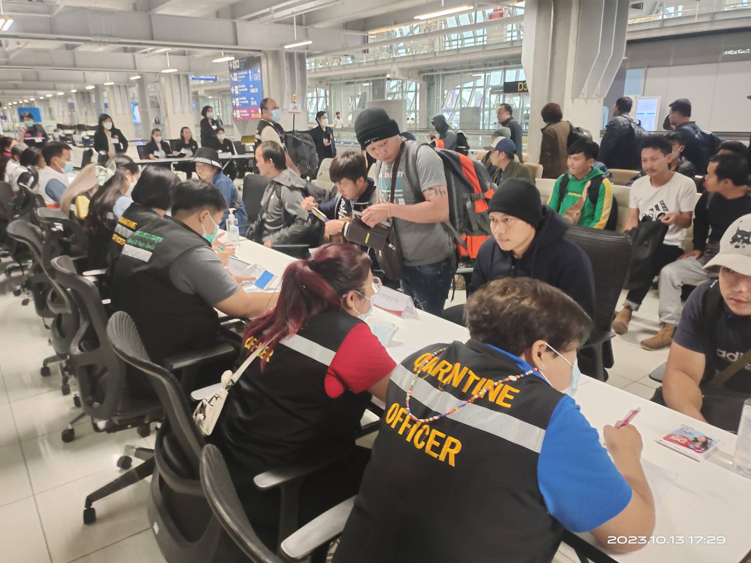สำหรับการดูแลสุขภาพคนไทยที่เดินทางกลับจากเหตุการณ์ความไม่สงบในอิสราเอล โดยทีมคัดกรองสุขภาพจากโรงพยาบาลบางพลี จังหวัดสมุทรปราการ กรมสุขภาพจิต และกรมควบคุมโรค ได้ตรวจคัดกรองเพื่อประเมินสุขภาพกายและสุขภาพจิต พบว่า มีผู้ได้รับบาดเจ็บจากการถูกยิง 2 ราย รายแรก ชายอายุ 38 ปี ภูมิลำเนาจังหวัดนครพนม มีแผลบริเวณสะโพก ได้รับการรักษาบาดแผลมาแล้ว มีอาการปวดเข่าซ้าย รายที่ 2 ชายอายุ 26 ปี ภูมิลำเนาจังหวัดขอนแก่น มีแผลที่บริเวณเชิงกราน ได้รับการรักษาบาดแผลมาแล้วเช่นกัน ยังปวดแผลเล็กน้อย ทีมแพทย์ส่งตัวไปนอนโรงพยาบาลบางพลี เพื่อสังเกตอาการและตรวจร่างกายเพิ่มเติม