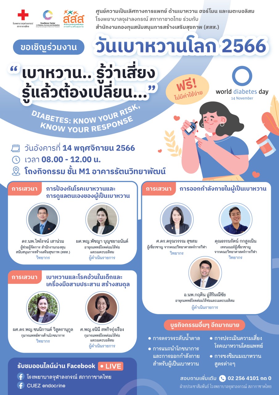 ศูนย์ความเป็นเลิศทางการแพทย์ ด้านเบาหวาน ฮอร์โมน และเมตะบอลิสม รพ.จุฬาลงกรณ์ ร่วมกับ สสส. ขอเชิญร่วมงานวันเบาหวานโลก 2566 "เบาหวาน..รู้ว่าเสี่ยง รู้แล้วต้องเปลี่ยน. พบกับการเสวนาและบูธกิจกรรมอื่นๆ อีกมากมาย ฟรีไม่มีค่าใช้จ่าย ในวันอังคารที่ 14 พฤศจิกายน 2566 เวลา 08.00 - 12.00 น. โถงกิจกรรม ชั้น M1 อาคารรัตนวิทยาพัฒน์ หรือรับชมผ่าน Facebook Live : โรงพยาบาลจุฬาลงกรณ์ สภากาชาดไทย และ CUEZ endocrine สอบถามเพิ่มเติม 02 256 4101 กด 0