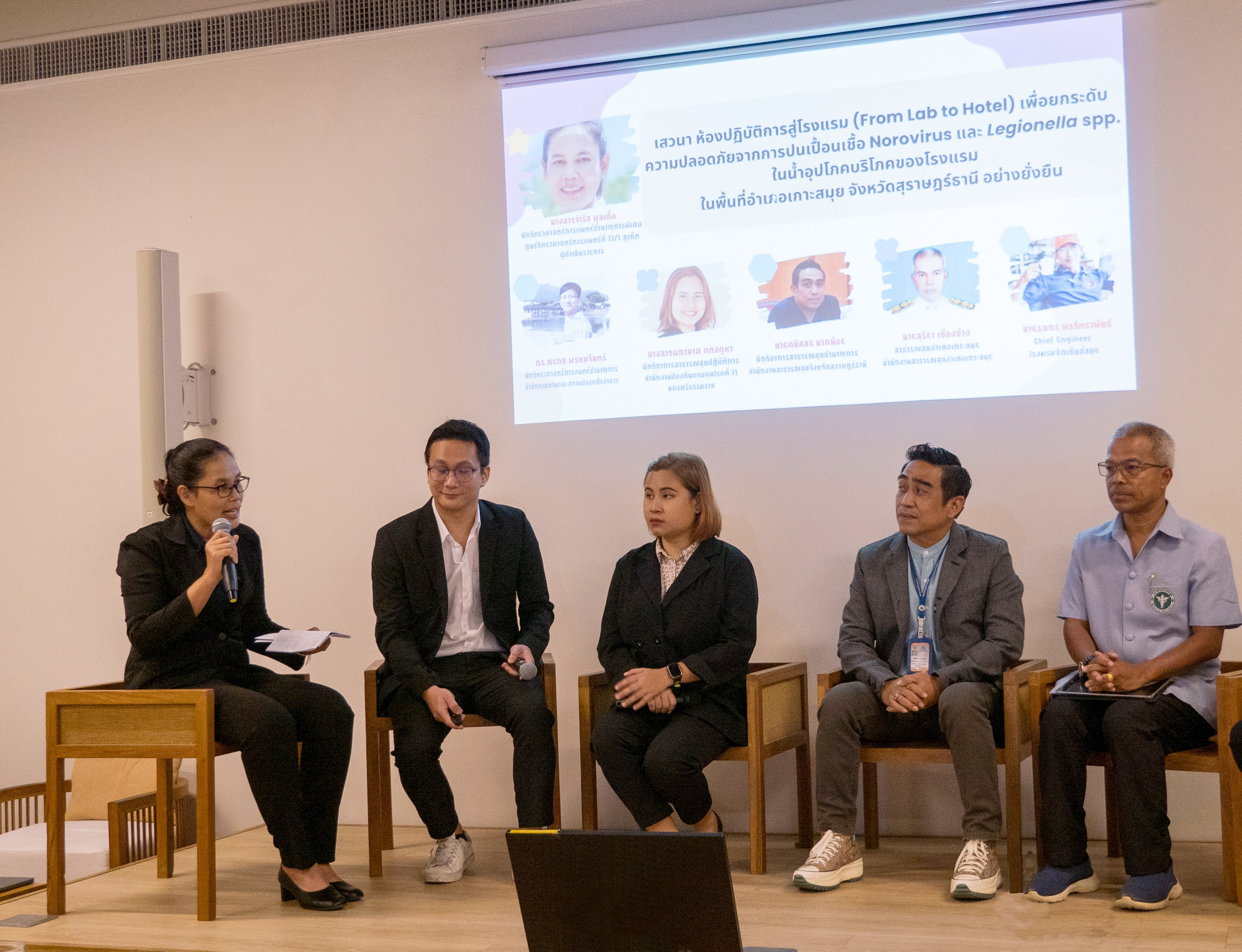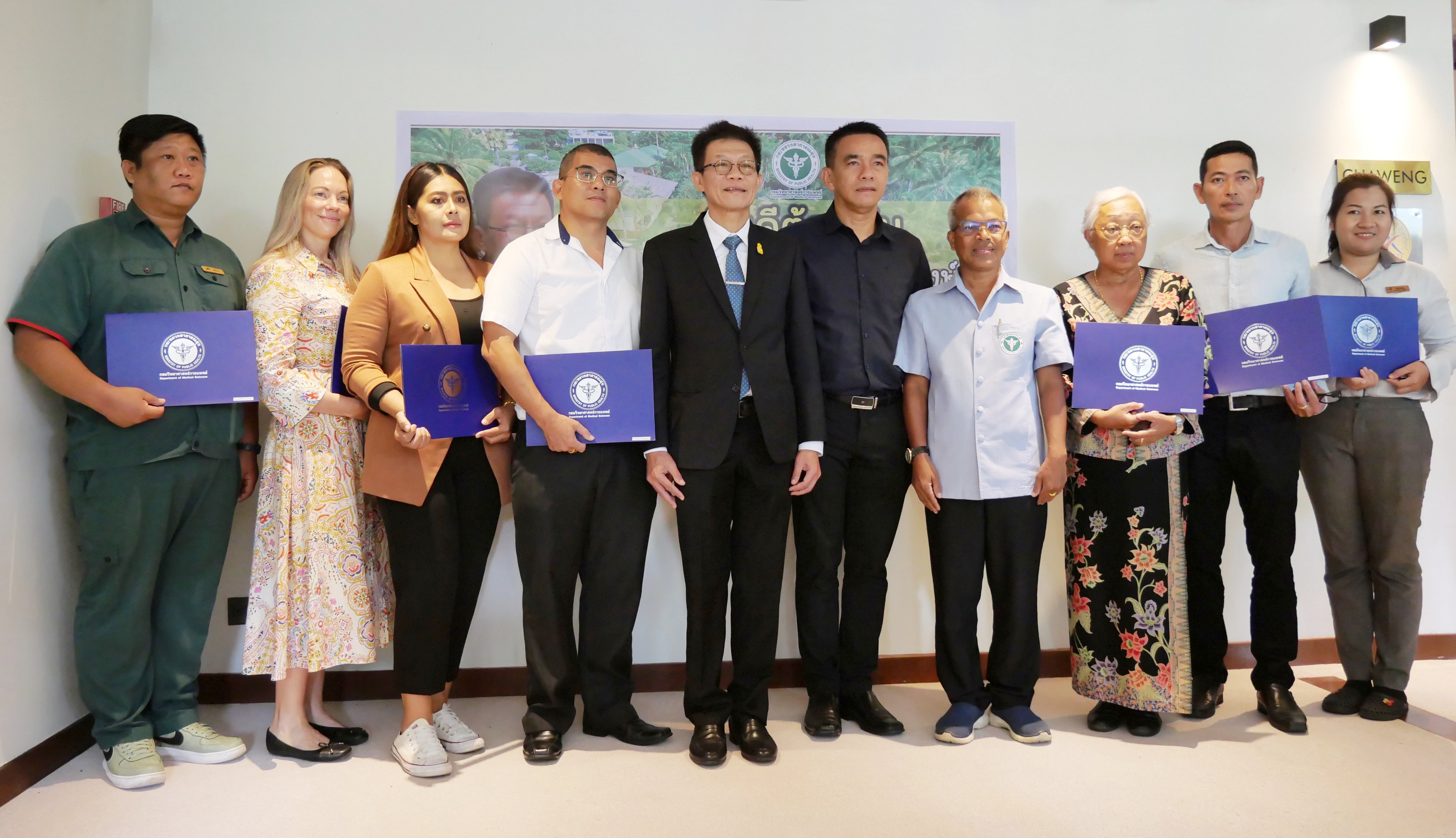 ด้าน นายแพทย์บัลลังก์ อุปพงษ์ รองอธิบดีกรมวิทยาศาสตร์การแพทย์ กล่าวเสริมว่า ศูนย์วิทยาศาสตร์การแพทย์ที่ 11 สุราษฎร์ธานี ได้มีการจัดประชุมถ่ายทอดองค์ความรู้ การเฝ้าระวังการปนเปื้อนเชื้อโนโรไวรัส และเชื้อลีจิโอเนลลา ในน้ำอุปโภคบริโภคของโรงแรม ในพื้นที่อำเภอเกาะสมุยอย่างต่อเนื่อง พร้อมมอบประกาศนียบัตรให้แก่โรงแรมที่ผ่านการตรวจประเมิน โดยมีผู้ประกอบการ และเจ้าหน้าที่ผู้รับผิดชอบงานสุขาภิบาลน้ำอุปโภคบริโภคจากโรงแรมในพื้นที่อำเภอเกาะสมุย สมาคมส่งเสริมการท่องเที่ยวเกาะสมุย ผู้บริหาร นักวิชาการจากกรมวิทยาศาสตร์การแพทย์ ศูนย์วิทยาศาสตร์การแพทย์ที่ 11 สุราษฎร์ธานี สำนักงานป้องกันควบคุมโรคที่ 11 นครศรีธรรมราช สำนักงานสาธารณสุขจังหวัดสุราษฎร์ธานี สำนักงานสาธารณสุขอำเภอเกาะสมุย เทศบาลนครเกาะสมุย เจ้าหน้าที่ด้านสาธารณสุขจากหน่วยงานเครือข่ายในพื้นที่ เข้าร่วมประชุม