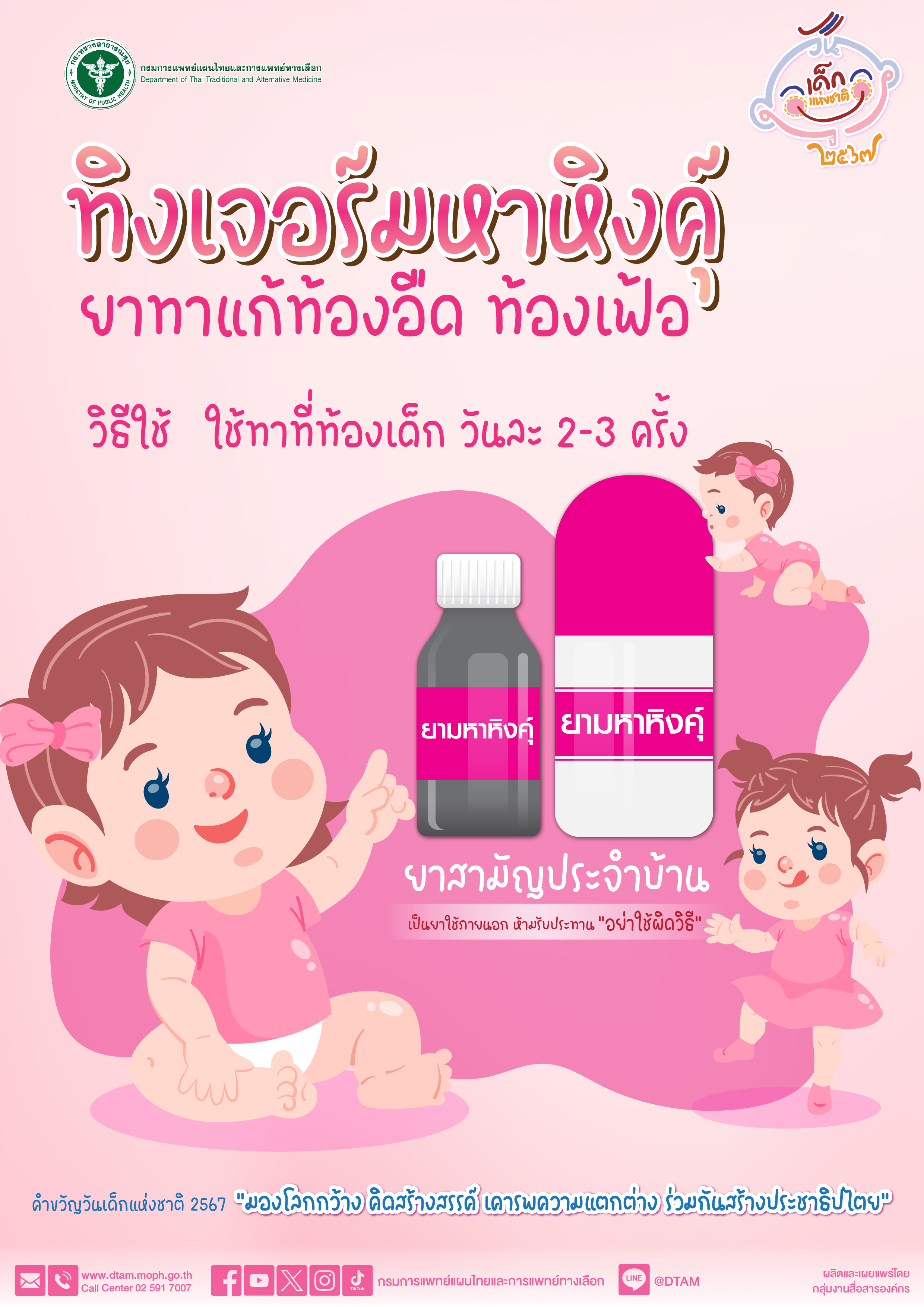 กรมการแพทย์แผนไทยและการแพทย์ทางเลือก แนะนำการใช้ยามหาหิงคุ์ ในรายการยาสามัญ ประจำบ้าน ตามประกาศกระทรวงสาธารณสุข ช่วยแก้อาการท้องอืด ท้องเฟ้อในเด็ก เบื้องต้นได้ผลดี เนื่องในวันเด็กแห่งชาติ