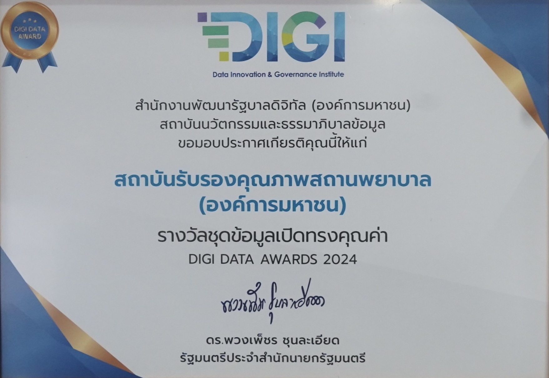 แพทย์หญิงปิยวรรณ ลิ้มปัญญาเลิศ ผู้อำนวยการสถาบันรับรองคุณภาพสถานพยาบาล เข้ารับรางวัลชุดข้อมูลเปิดทรงคุณค่า (DIGI Data Awards 2024) จาก นางพวงเพ็ชร ชุนละเอียด รัฐมนตรีประจำสำนักนายกรัฐมนตรี ประธานในพิธี ในงานมอบประกาศนียบัตรรางวัลข้อมูลเปิดภาครัฐ (Open Data Awards) และ เข้าร่วมงานวันข้อมูลเปิดนานาชาติ ประจำปี พ.ศ. 2567 (International Open Data Day 2024) ในวันอังคารที่ 5 มีนาคม 2567 เวลา 12.30 – 16.20 น. ณ ห้อง Learning Studio ชั้น 1 สถาบันเพื่อการยุติธรรมแห่งประเทศไทย