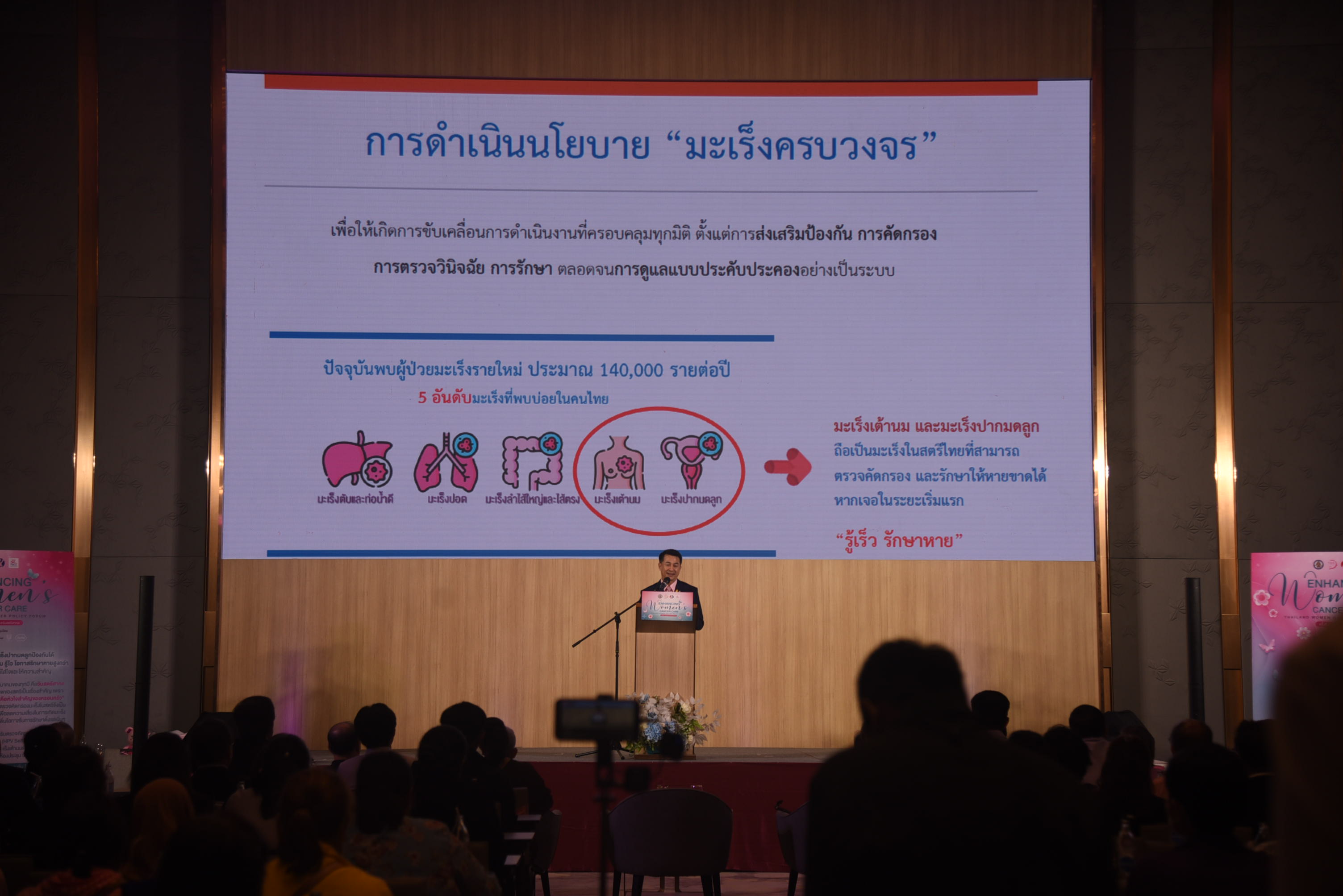 นายแพทย์ชลน่าน ศรีแก้ว รัฐมนตรีว่าการกระทรวงสาธารณสุข กล่าวว่า การประชุมในครั้งนี้สอดคล้องกับการขับเคลื่อนก้าวต่อไปในการดำเนินนโยบายเชิงรุกด้านมะเร็งในสตรีของกระทรวงสาธารณสุข หลังจากสำนักงานหลักประกันสุขภาพแห่งชาติมีการบรรจุสิทธิประโยชน์ด้านการตรวจคัดกรองมะเร็งปากมดลูกด้วย เอชพีวี ดีเอ็นเอ เทสต์ (HPV DNA Test) และการตรวคัดกรองฯ แบบเก็บตัวอย่างด้วยตนเอง (HPV DNA Self-sampling Test) ฟรี ไม่เสียค่าใช้จ่ายสำหรับทุกสิทธิ์การรักษา รวมทั้งคณะกรรมการหลักประกันสุขภาพแห่งชาติยังได้พิจารณาและเห็นชอบ “ข้อเสนอการตรวจคัดกรองมะเร็งเต้านม ด้วยเครื่องแมมโมแกรมและอัลตราซาวด์” ในระบบหลักประกันสุขภาพแห่งชาติแล้ว สู่การหารือแนวทาง ตลอดจนวิธีการดำเนินการอย่างเป็นรูปธรรม อาทิ การเพิ่มการเข้าถึงการตรวจคัดกรองฯ การจัดให้มีกองทุนมะเร็งเพื่อความเท่าเทียมในการเข้าถึงยานวัตกรรมสำหรับรักษามะเร็งได้ตั้งแต่ระยะเริ่มต้นโดยไม่มีค่าใช้จ่ายเป็นอุปสรรค รวมทั้งการเตรียมระบบรองรับการตรวจคัดกรองมะเร็งเต้านมตามสิทธิประโยชน์เพิ่มเติม