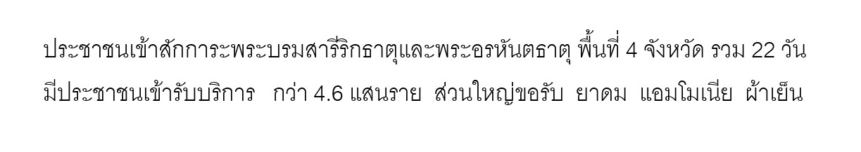 ปลัดกระทรวงสาธารณสุข สรุปผลการดูแลสุขภาพประชาชนที่เดินทางเข้าสักการะพระบรมสารีริกธาตุและพระอรหันตธาตุ ในพื้นที่ 4 จังหวัด รวม 22 วัน มีประชาชนเข้ารับบริการกว่า 4.6 แสนราย ส่วนใหญ่ขอรับยาดม แอมโมเนีย ผ้าเย็น ให้การปฐมพยาบาล 5.4 หมื่นราย ตรวจรักษาโรคเกือบ 2 พันราย นำส่งโรงพยาบาล 66 ราย พบอาการหลอดเลือดสมอง 2 ราย หัวใจขาดเลือด 2 ราย ได้รับการดูแลรักษาแล้ว