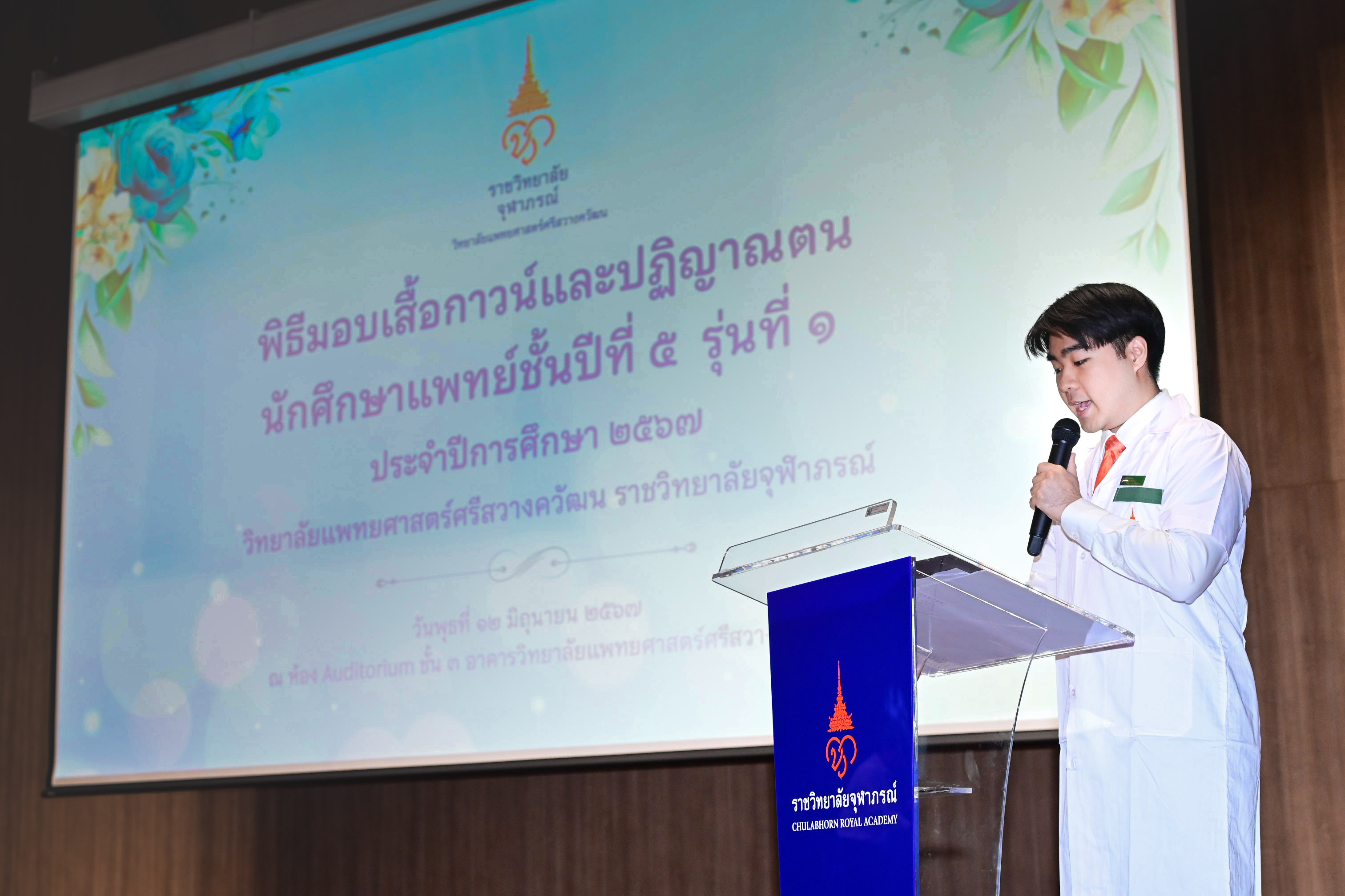 วิทยาลัยแพทยศาสตร์ศรีสวางควัฒน ราชวิทยาลัยจุฬาภรณ์ จัดพิธีมอบเสื้อกาวน์ และปฎิญาณตน ปฐมนิเทศนักศึกษาแพทย์ชั้นคลินิก MD-PSCM รุ่นที่ 1 ผ่านกิจกรรม “ Year 5 Introduction and Orientation Module ( IOM ) ” โดยมีศาสตราจารย์เกียรติคุณ นายแพทย์รัชตะ รัชตะนาวิน รักษาการรองเลขาธิการราชวิทยาลัยจุฬาภรณ์ เป็นประธานในพิธี พร้อมด้วย ศาสตราจารย์ แพทย์หญิงยุวเรศมคฐ์ สิทธิชาญบัญชา รักษาการรองเลขาธิการราชวิทยาลัยจุฬาภรณ์ รองศาสตราจารย์ นายแพทย์ธีรภัทร อึ้งตระกูล รักษาการคณบดีวิทยาลัยแพทยศาสตร์ศรีสวางควัฒน ผู้ช่วยศาสตราจารย์ นายแพทย์วิสุทธิ์ ล้ำเลิศธน รักษาการรองคณบดีวิทยาลัยแพทยศาสตร์ศรีสวางควัฒน นายแพทย์สุรชัย โชคครรชิตไชย ผู้อำนวยการโรงพยาบาลนครปฐม นายแพทย์นพดล พิษณุวงษ์ ผู้อำนวยการโรงพยาบาลเพชรบูรณ์ และคณะผู้บริหารจากวิทยาลัยแพทยศาสตร์ศรีสวางควัฒน โรงพยาบาลจุฬาภรณ์ โรงพยาบาลนครปฐม และโรงพยาบาลเพชรบูรณ์ เข้าร่วมอย่างพร้อมเพรียง ซึ่งจัดขึ้นระหว่างวันที่ 12 – 14 มิถุนายน 2567 ณ อาคารวิทยาลัยแพทยศาสตร์ศรีสวางควัฒน ราชวิทยาลัยจุฬาภรณ์ เขตหลักสี่ กรุงเทพมหานคร