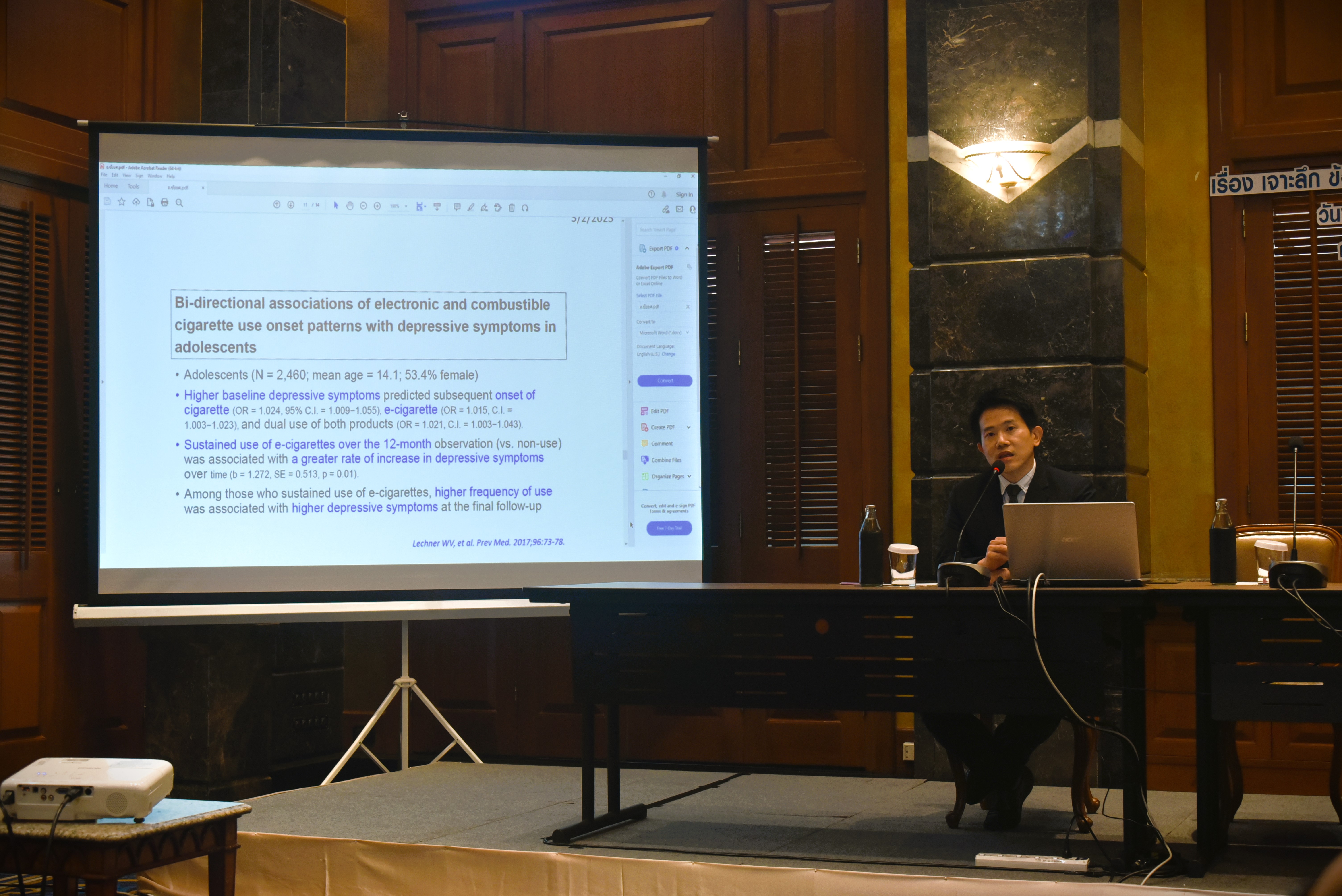 รศ.นพ.นิธิพัฒน์ เจียรกุล ราชวิทยาลัยอายุรแพทย์แห่งประเทศไทย กล่าวถึง ผลกระทบของบุหรี่ ไฟฟ้าต่อสุขภาพไอบุหรี่ไฟฟ้าที่สูบเข้าไปจะทำให้เยื่อบุระบบการหายใจอักเสบตั้งแต่จมูก คอหอย หลอดลม ลงไปจนถึงถุงลมปอด เซลล์จะอายุสั้น ซึ่งทำให้สมรรถภาพปอดถดถอย เร่งให้เกิดโรคถุงลมโป่ งพอง เสี่ยงต่อ มะเร็งปอดและมะเร็งในทุกอวัยวะ ไอบุหรี่ไฟฟ้ามีน้ำมันและสารเคมีกว่า 7,000 ชนิด ทำให้เสี่ยงเกิดปอด อักเสบเฉียบพลัน EVALI (E-cigarette or Vaping product use associated Acute Lung Injury) ถึงตายได้ อย่างเฉียบพลัน ทั้งนี้บุหรี่ไฟฟ้าทุกชนิดมีนิโคตินซ่ึงเป็นสารเสพติด มีฤทธิ์ทา ใหห้ ลอดเลือดหดตวั สร้างสาร อักเสบ และมีอนุมูลอิสระท าให้เซลล์ผิดปกติ จึงเป็นอันตรายต่อร่างกายทุกระบบ ไม่ควรน ามาใช้ทดแทนบุหรี่ มวน และไม่แนะน าให้ใช้เป็นเครื่องมือในการเลิกบุหรี่