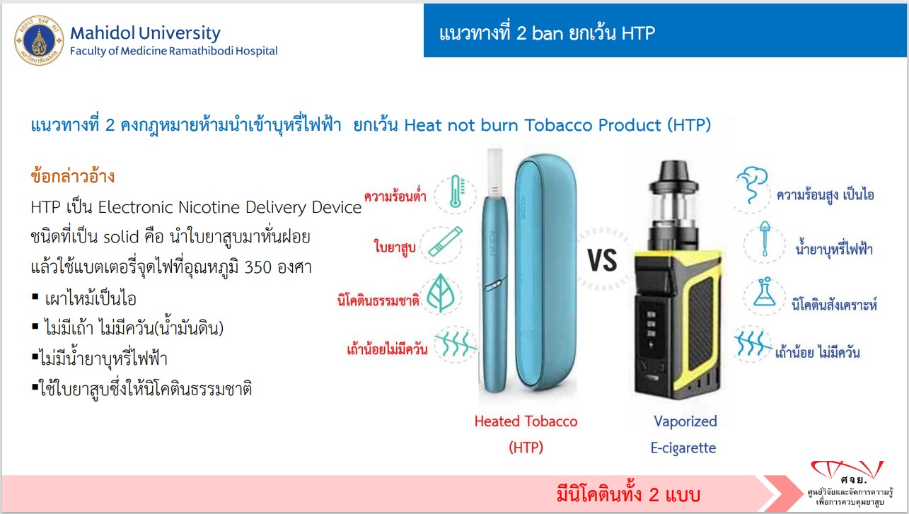 แนวทางที่ 2 คงกฎหมายห้ามน าเข้าบุหรี่ไฟฟ้า ยกเว้น Heat not burn Tobacco Product (HTP)ข้อดี1) HTP เป็น Electronic Nicotine Delivery Device ชนิดที่เป็น solid คือ นำใบยาสูบมาหั่นฝอย โดยจะใช้ความร้อนจากอุปกรณ์มากกว่า 300องศาเซลเซียส แต่ไม่เกิน 600องศาเซลเซียสเหมือนการเผา ไหม้บุหรี่ทั่วไป 2) มีการเผาไหม้เป็นไอ ไม่มีเถ้า ไม่มีควัน (น ้ามันดิน) ไม่มีน ้ายาบุหรี่ไฟฟ้า ใช้ใบยาสูบซึ่งให้ นิโคตินธรรมชาติข้อเสีย 1) ยังคงมีนิโคติน ผลิตภัณฑ์ HTP จะต้องมีค าเตือนว่า เป็นผลิตภัณฑ์ที่มีนิโคติน ซึ่ง เป็นสารเสพติด และองค์การอาหารและยาของสหรัฐอเมริกา (FDA) ยังไม่อนุญาต ซึ่งผู้ผลิต IQOS ก็ยอมรับ ว่าเป็นอันตรายต่อสุขภาพ และไม่ได้ลดความเสี่ยงเมื่อเปลี่ยนมาใช้ HTP 2) HIP นิยมทำเป็น hybrid เลือก ชนิดที่เป็น stick หรือ e-juice ได้ในผลิตภัณฑ์เดียวจึงไม่สามารถแยกแยะว่าเป็น E- cig หรือ HTP ดังนั้น แนวทางที่ 2 จึงไม่แตกต่างจาก แนวทางที่ 3