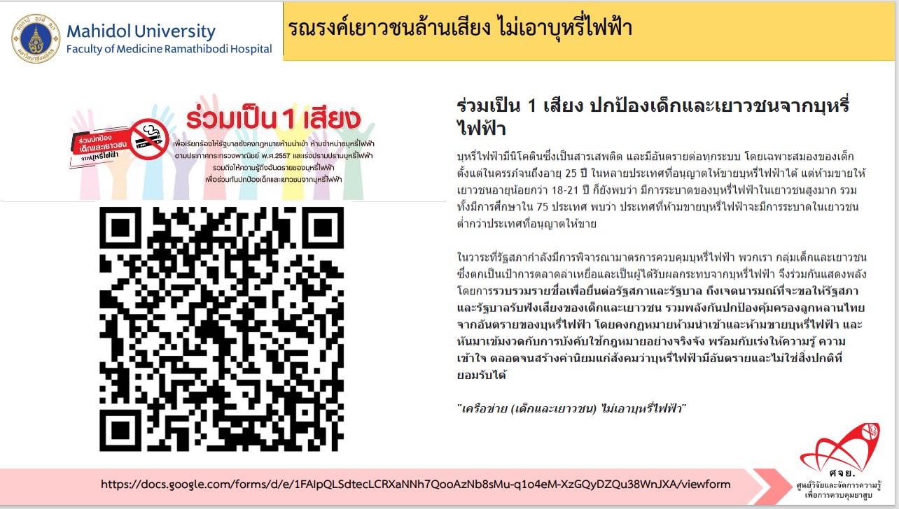 พร้อมกันนี้ศูนย์วิจัยและจัดการความรู้เพื่อการควบคุมยาสูบขอเชิญชวนทุกภาคส่วนร่วมแสดงเจตจำนงค์ลงชื่อ ร่วมเป็น1 เสียงปกป้องเยาวชน ล้านเสียงไม่เอาบุหรี่ไฟฟ้า