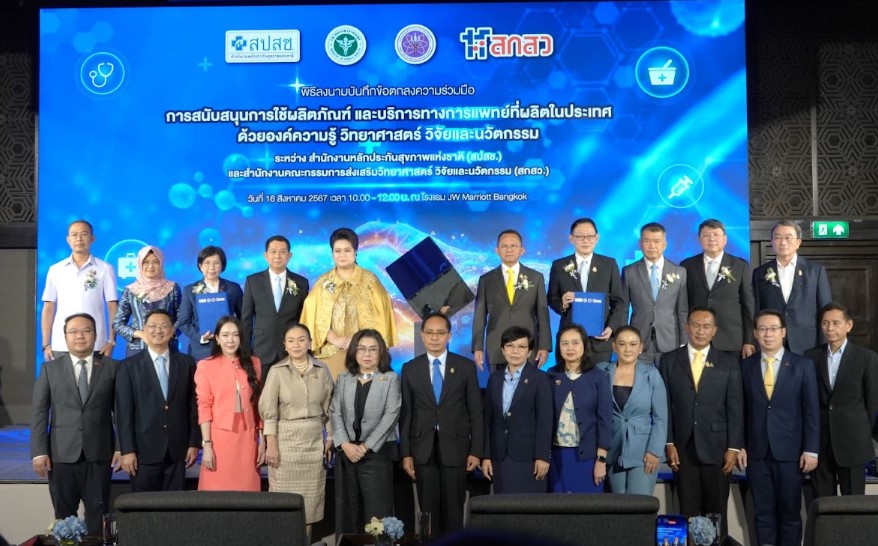 วันที่ 16 สิงหาคม 2567 – กระทรวงสาธารณสุข (สธ.) โดยสำนักงานหลักประกันสุขภาพแห่งชาติ (สปสช.) และกระทรวงการอุดมศึกษา วิทยาศาสตร์ วิจัยและนวัตกรรม (อว.) โดยสำนักงานคณะกรรมการส่งเสริม วิทยาศาสตร์ วิจัยและนวัตกรรม (สกสว.) ร่วมสนับสนุนและขับเคลื่อนการใช้ผลิตภัณฑ์และบริการทางการแพทย์ที่ได้มาตรฐานและผลิตในประเทศ และสร้างความเชื่อมั่นในการใช้ผลิตภัณฑ์และบริการทางการแพทย์ที่ได้จากผลงานวิจัยและนวัตกรรมของประเทศ รวมไปถึงการส่งเสริมการวิจัยและพัฒนาผลิตภัณฑ์และบริการทางการแพทย์ให้มีมาตรฐานและสามารถผลิตได้ในประเทศ ที่สอดคล้องกับความต้องการของผู้มีสิทธิในหลักประกันสุขภาพแห่งชาติ และสื่อสารเชิงนโยบายกับหน่วยงานที่เกี่ยวข้อง รวมทั้งสื่อสารประชาสัมพันธ์สู่สาธารณะ หน่วยงานในระบบวิทยาศาสตร์ วิจัยและนวัตกรรม นักวิจัย และผู้ที่เกี่ยวข้อง โดยมีนายสมศักดิ์ เทพสุทิน รัฐมนตรีว่าการกระทรวงสาธารณสุข นางสาวศุภมาส อิศรภักดี รัฐมนตรีว่าการกระทรวงการอุดมศึกษา วิทยาศาสตร์ วิจัยและนวัตกรรม ร่วมเป็นประธานในพิธี พร้อมด้วย รศ. ดร.ปัทมาวดี โพชนุกูล ผู้อำนวยการสำนักงานคณะกรรมการส่งเสริมวิทยาศาสตร์ วิจัยและนวัตกรรม และนายจเด็จ ธรรมธัชอารี เลขาธิการสำนักงานหลักประกันสุขภาพแห่งชาติ เป็นผู้ลงนามบันทึกข้อตกลงความร่วมมือ “การสนับสนุนการใช้ผลิตภัณฑ์และบริการทางการแพทย์ที่ผลิตในประเทศ”