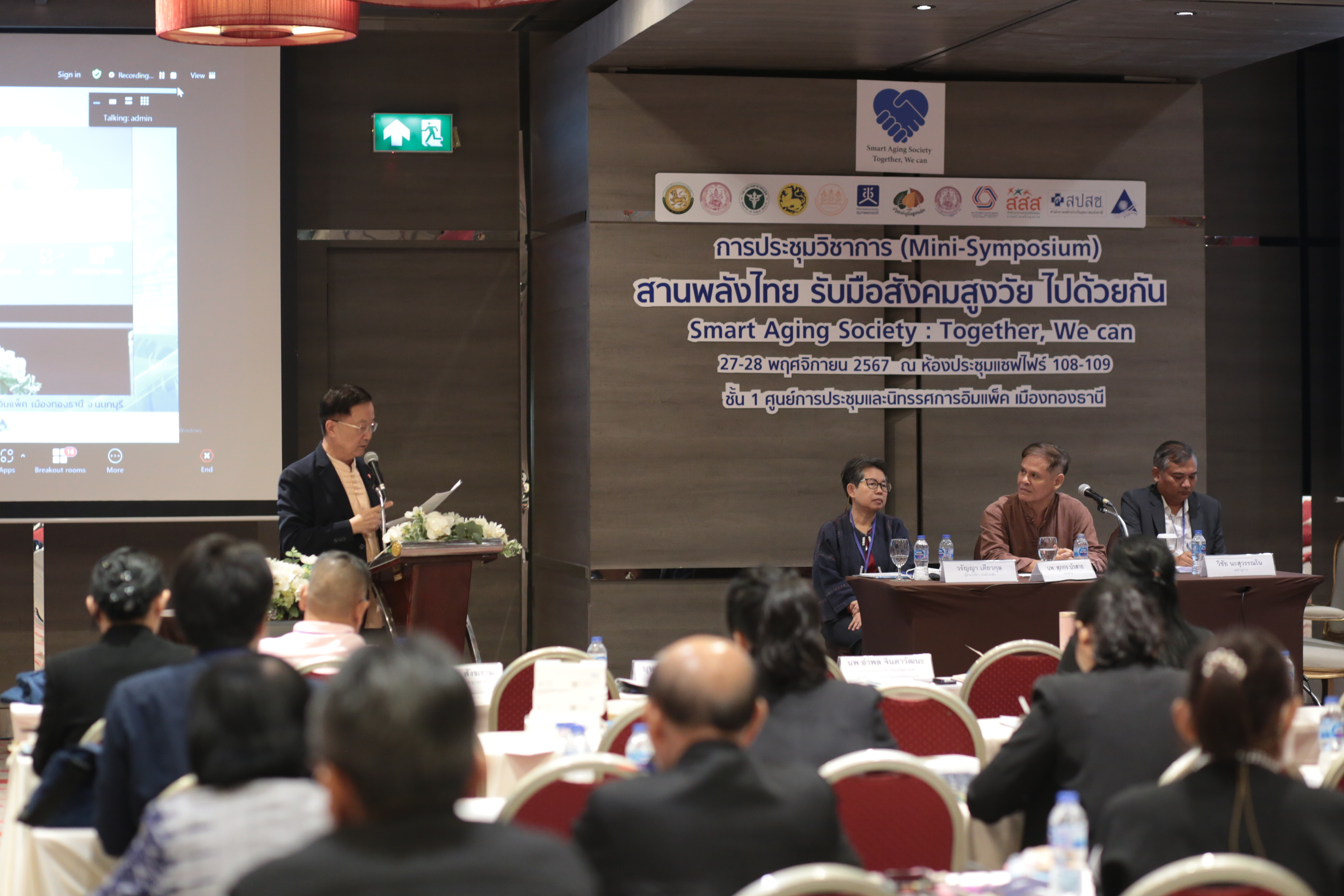 การประชุมวิชาการ (Mini-symposium) สานพลังไทย รับมือสังคมสูงวัย ไปด้วยกัน (Smart Aging Society : Together, We can) จัดขึ้นที่อิมแพ็ค เมืองทองธานีเมื่อเร็วๆ นี้ จัดโดยสำนักงานคณะกรรมการสุขภาพแห่งชาติ (สช.) ร่วมกับมูลนิธิสานพลังเพื่อแผ่นดิน (มสผ.) และองค์กรเจ้าภาพอีก 10 องค์กร ได้แก่ สภาพัฒนาการเศรษฐกิจและสังคมแห่งชาติ, กระทรวงมหาดไทย, กระทรวงสาธารณสุข, กระทรวงการพัฒนาสังคมและความมั่นคงของมนุษย์, กรมกิจการผู้สูงอายุ, กรมส่งเสริมการปกครองท้องถิ่น, สำนักงานกองทุนสนับสนุนการสร้างเสริมสุขภาพ, สำนักงานหลักประกันสุขภาพแห่งชาติ, สถาบันวิจัยระบบสาธารณสุข และสถาบันพัฒนาองค์กรชุมชน (องค์การมหาชน) ซึ่งเป็นเวทีคู่ขนานกับการประชุมสมัชชาสุขภาพแห่งชาติ 2567 มีผู้เข้าร่วมกว่าประมาณ 200 คน จากทุกภาคส่วนทั้งภาครัฐ เอกชน ประชาสังคม และนักวิชาการ โดยมีนักคิดคนสำคัญร่วมปาฐกถา พบเรื่อง “สังคมสูงวัย” ยังไม่มีหน่วยงานใดรับผิดชอบโดยตรง มีแต่การดูแลสวัสดิการ สงเคราะห์ และช่วยเหลือผู้สูงอายุ และคาดผลิตแรงงานไม่ทันกับความต้องการ รวมไปถึงระบบโครงสร้างต่างๆ ยังไม่รองรับกับความเปลี่ยนแปลงในสังคมที่มีผู้สูงอายุจำนวนมาก เด็กเกิดน้อย แรงงานลดลง พร้อมนำเสนอกรณีทางออก 14 กรณีตัวอย่างขับเคลื่อนสังคมสูงวัยนำเสนอและแลกเปลี่ยนประสบการณ์