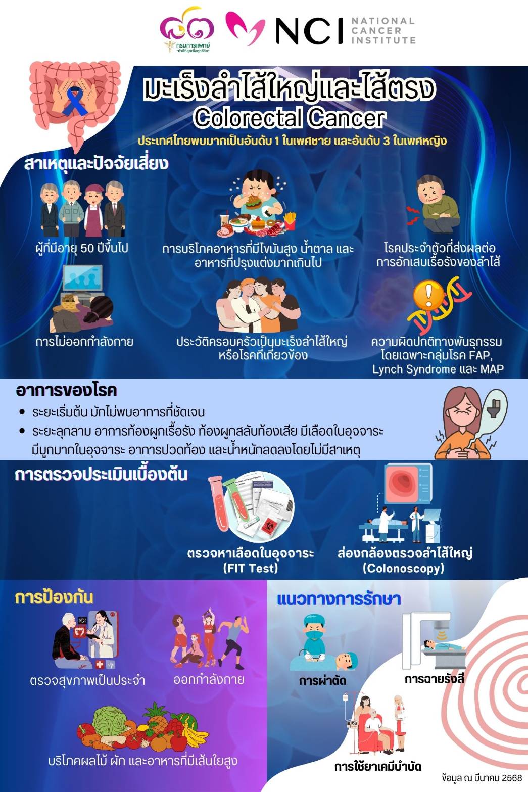 มีนาคมของทุกปี เดือนที่ทั่วโลกร่วมรณรงค์ต้านภัยมะเร็งลำไส้ใหญ่และไส้ตรง สถาบันมะเร็งแห่งชาติ กรมการแพทย์ แนะ มะเร็งลำไส้ใหญ่และไส้ตรงพบได้บ่อยในคนไทย เชิญชวนประชาชนร่วมตระหนักถึงพิษภัยและใส่ใจลดความเสี่ยงเพื่อป้องกันการเกิดโรค ในประเทศไทย โรคมะเร็งลำไส้ใหญ่และไส้ตรงพบมากเป็นอันดับ 1 ในเพศชายและอันดับ 3 ในเพศหญิง (สถิติสถาบันมะเร็งแห่งชาติ) และมีแนวโน้มเพิ่มสูงขึ้นอย่างต่อเนื่อง อัตราเสียชีวิต เฉลี่ยวันละ 15 คน (ปีละ 5,476 คน) ผู้ป่วยใหม่ เฉลี่ยวันละ 44 คน (ปีละ 15,939 คน) สาเหตุและปัจจัยเสี่ยงเกิดจากอายุที่มากขึ้น