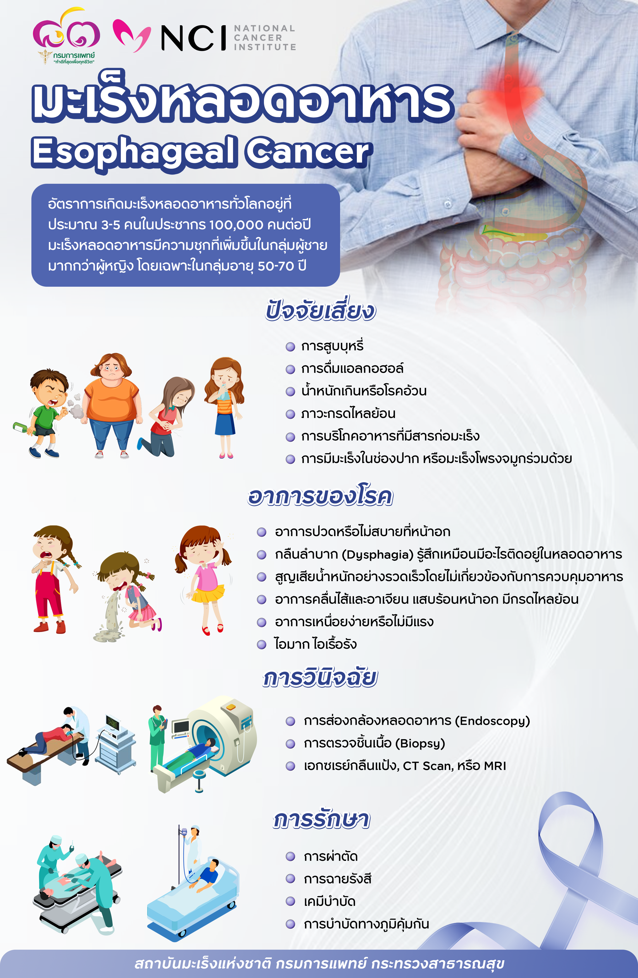 มะเร็งหลอดอาหารเป็นโรคที่มีอันตรายและต้องการความสนใจอย่างเร่งด่วน การรู้จักและหลีกเลี่ยงปัจจัยเสี่ยง การวินิจฉัยอย่างถูกต้องและการรักษาที่เหมาะสม ช่วยลดอัตราการเสียชีวิตได้ หากท่านมีข้อสงสัย สามารถศึกษาเพิ่มเติมได้จากสถาบันมะเร็งแห่งชาติผ่านทาง Facebook : สถาบันมะเร็งแห่งชาติ National Cancer Institute และ LINE : NCI รู้สู้มะเร็ง