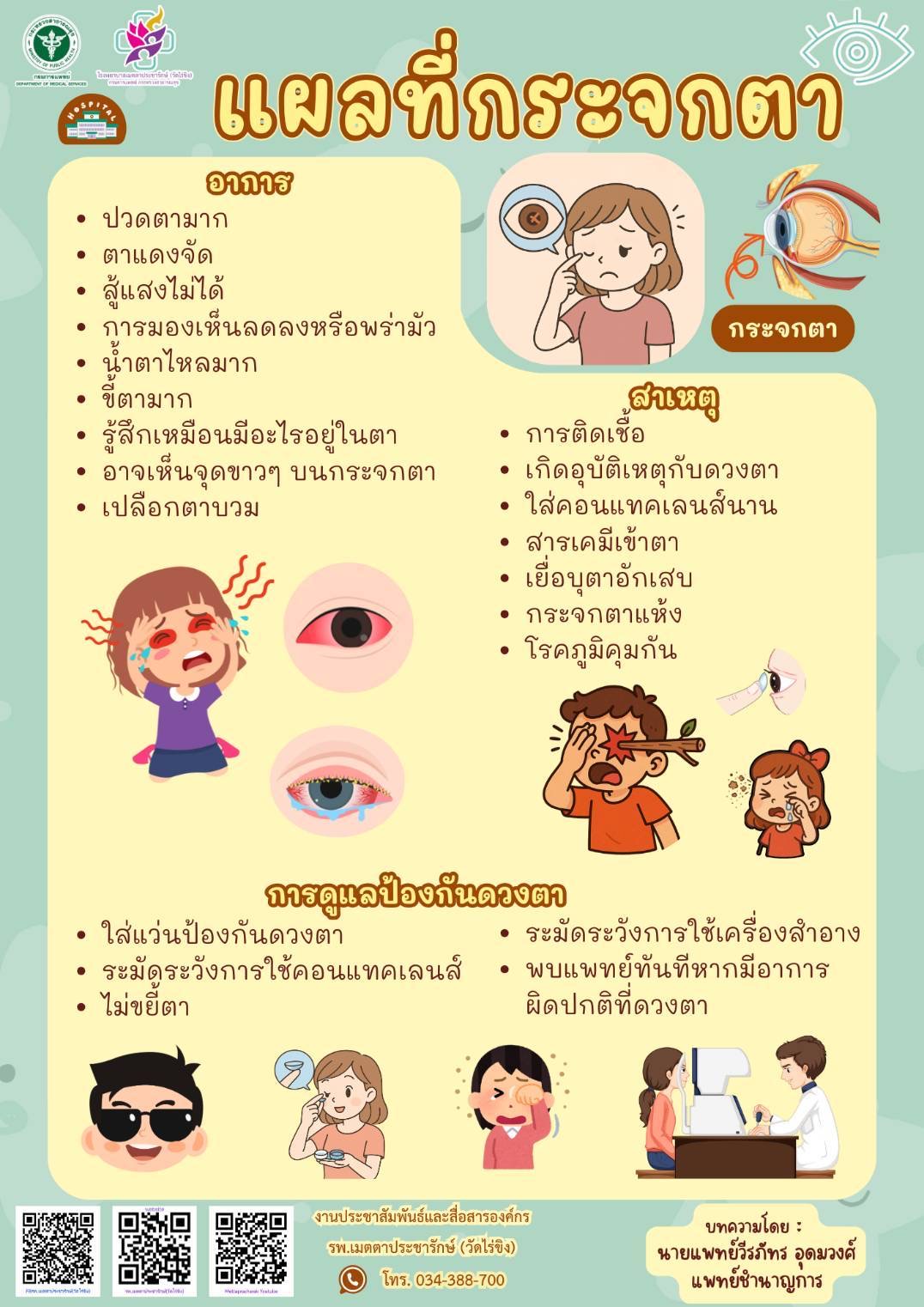 ขอขอบคุณ นายแพทย์ไพโรจน์ สุรัตนวนิวช รองอธิบดีกรมการแพทย์ และ นายแพทย์กิตติวัฒน์ มะโนจันทร์ ผู้อำนวยการโรงพยาบาลเมตตาประชารักษ์ (วัดไร่ขิง) อนุเคราะห์ข้อมูลจากบทความ รพ.เมตตาประชารักษ์ (วัดไร่ขิง) กรมการแพทย์ ชี้ “แผลที่กระจกตา” เป็นภาวะที่เกิดจากกระจกตาเกิดการอักเสบหรือมีบาดแผล