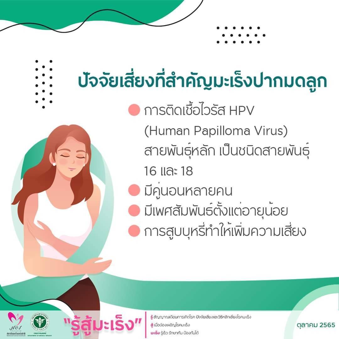 มะเร็งปากมดลูกเป็นหนึ่งในมะเร็งที่เราสามารถป้องกันได้จากการปฏิบัติตนเพื่อลดความเสี่ยงของการเกิดโรค รวมถึงการเข้ารับการตรวจคัดกรอง ซึ่งหากตรวจพบโรคในระยะเริ่มแรกจะทำให้การรักษาได้ผลดีมีโอกาสหายขาดจากโรคได้ ท่านสามารถติดตามความรู้ข่าวสารด้านโรคมะเร็งจากสถาบันมะเร็งแห่งชาติเพิ่มเติมได้ที่เว็บไซต์ส่งเสริมความรอบรู้สู้ภัยมะเร็ง http://allaboutcancer.nci.go.th/ เว็บไซต์ต่อต้านข่าวปลอมโรคมะเร็ง https://thaicancernews.nci.go.th/_v2/ และ Line : NCIรู้สู้มะเร็ง