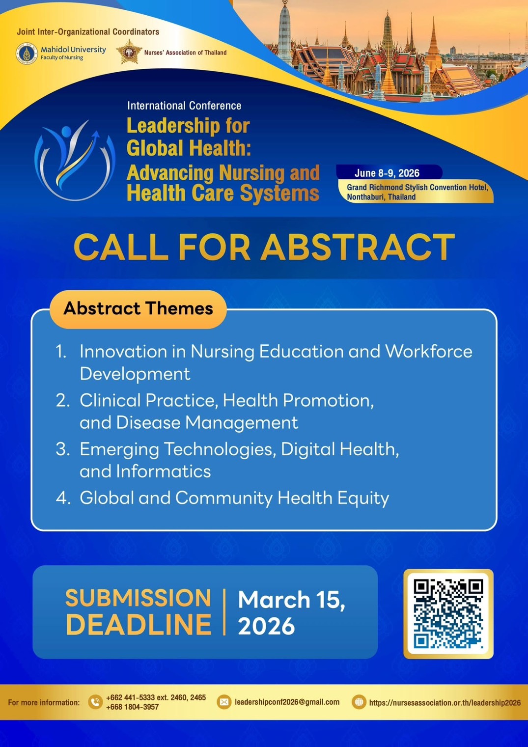 คณะแพทยศาสตร์ศิริราชพยาบาล และคณะพยาบาลศาสตร์ มหาวิทยาลัยมหิดล ร่วมกับ สมาคมพยาบาลแห่งประเทศไทย ในพระราชูปถัมภ์ฯ ขอประกาศเชิญชวนแพทย์ พยาบาลวิชาชีพ อาจารย์ นักวิจัย และบุคลากรสาธารณสุขทั่วประเทศ เข้าร่วมงานประชุมวิชาการระดับนานาชาติที่ยิ่งใหญ่ที่สุดแห่งปี เพื่อสร้างจุดเปลี่ยนสำคัญให้กับระบบสาธารณสุขไทยและโลก หัวข้อ “Leadership for Global Health: Advancing Nursing and Health Care Systems”วันที่ 8 – 9 มิถุนายน 2569 ณ Grand Richmond Stylish Convention Hotel จ.นนทบุรี