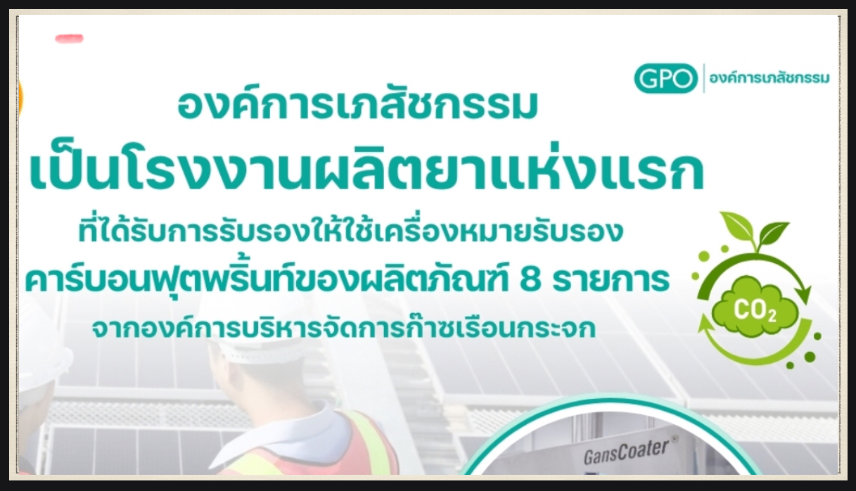 องค์การเภสัชกรรมเป็นโรงงานผลิตยาแห่งแรก ที่ได้รับการรับรองให้ใช้เครื่องหมายรับรองคาร์บอนฟุตพริ้นท์ของผลิตภัณฑ์ 8 รายการ