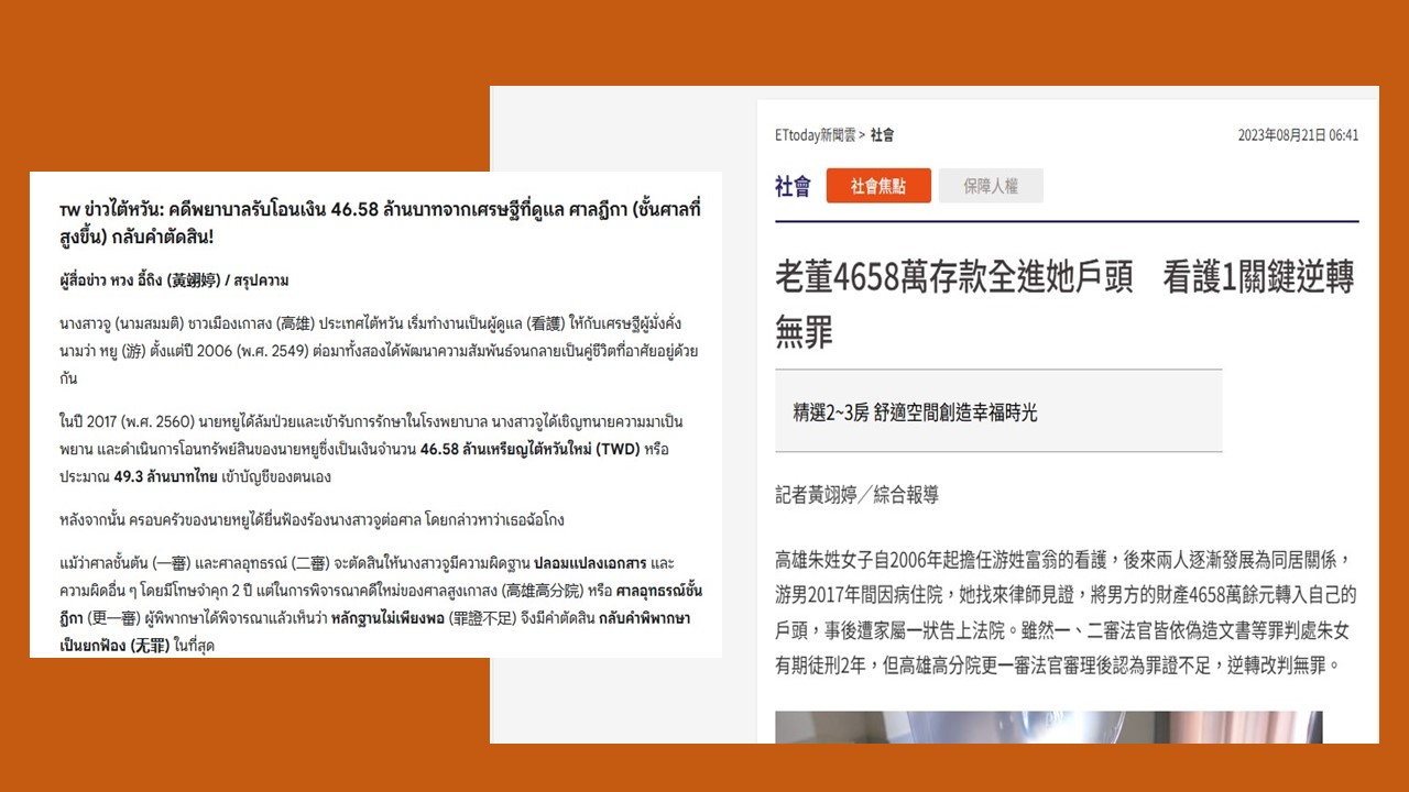 นี่คือบทสรุปสุดท้ายของคดีความที่กลายเป็นข่าวดังในไต้หวันเมื่อเดือนสิงหาคม พ.ศ. 2566 ศาลสูงเกาสง ได้สร้างบรรทัดฐานสำคัญ เมื่อตัดสิน ยกฟ้อง ข้อกล่าวหาฉ้อโกงพยาบาลผู้ดูแล โดยให้ความสำคัญกับ เจตจำนงของผู้ป่วย เหนือการฟ้องร้องของทายาททางสายเลือด คำตัดสินนี้ไม่เพียงแค่ยืนยันสิทธิ์ในทรัพย์สินมูลค่า 49.3 ล้านบาท แต่ยังเป็นบทพิสูจน์อันทรงพลังถึงคุณค่าแห่งวิชาชีพที่ปฏิบัติด้วยหัวใจ