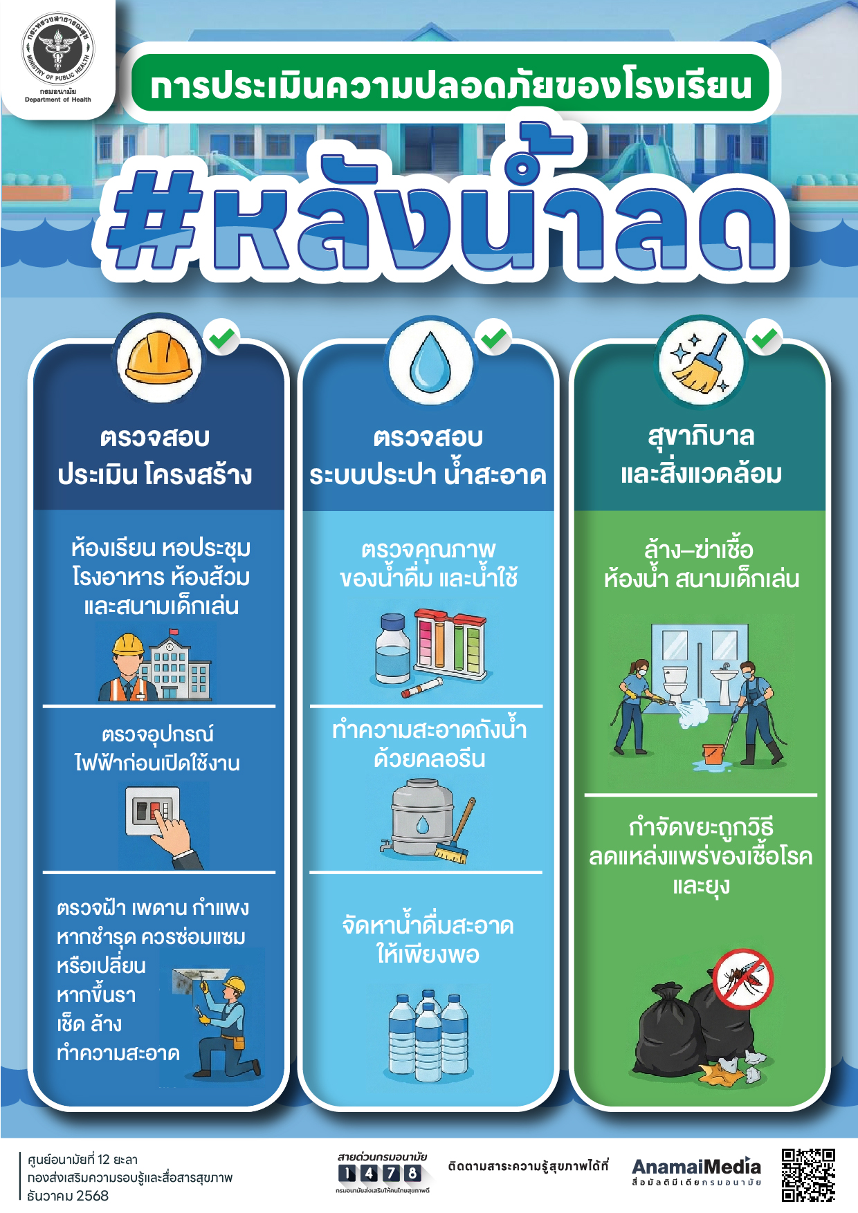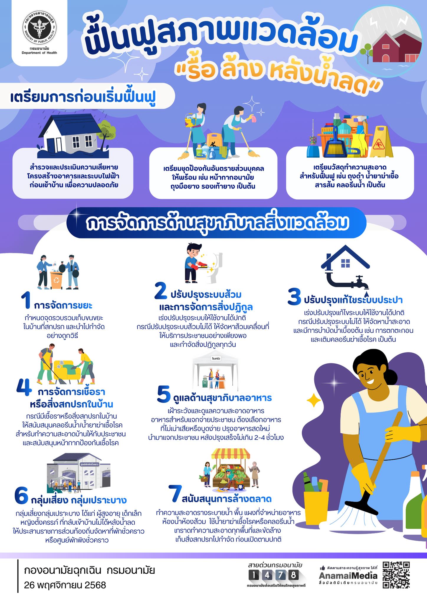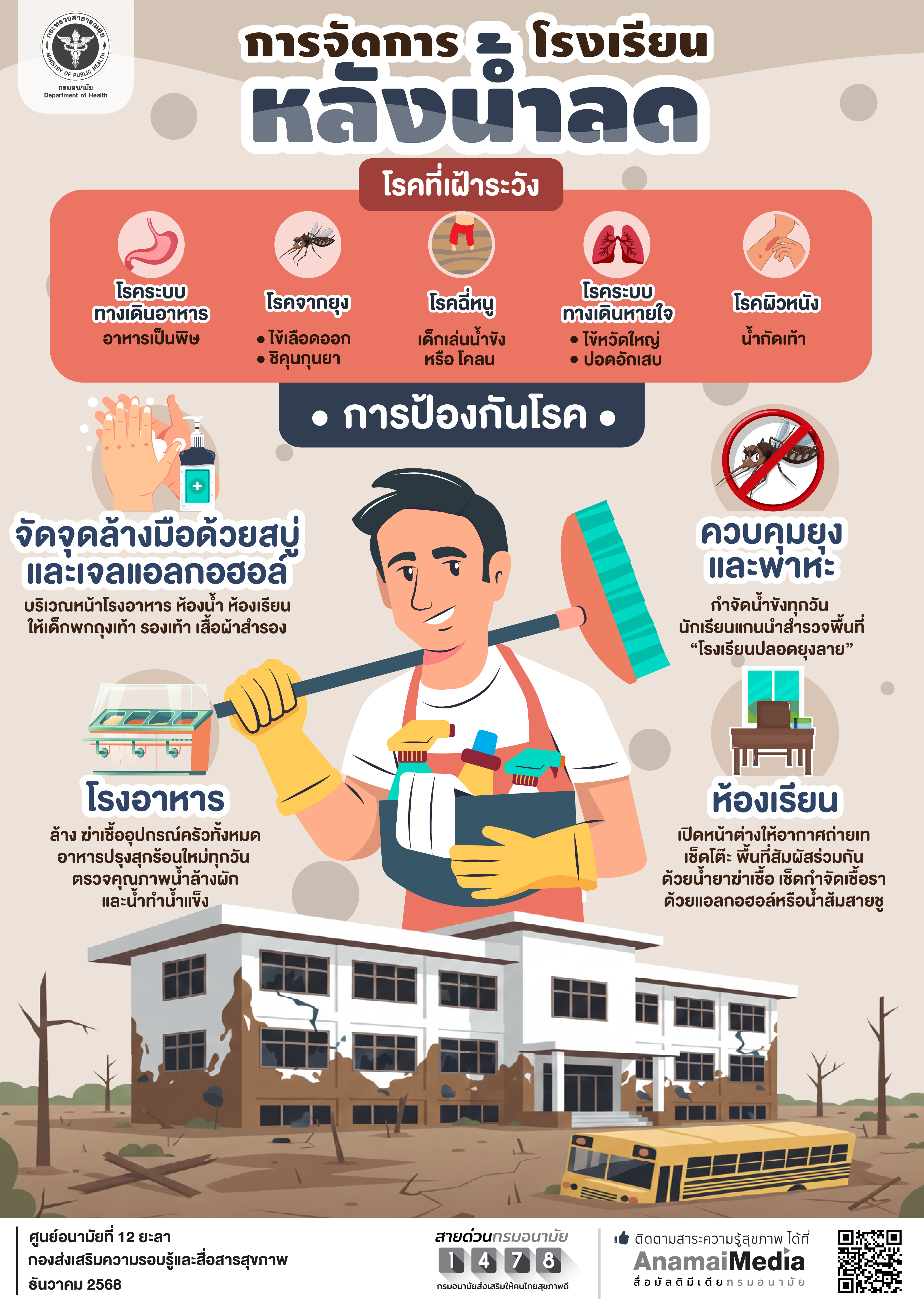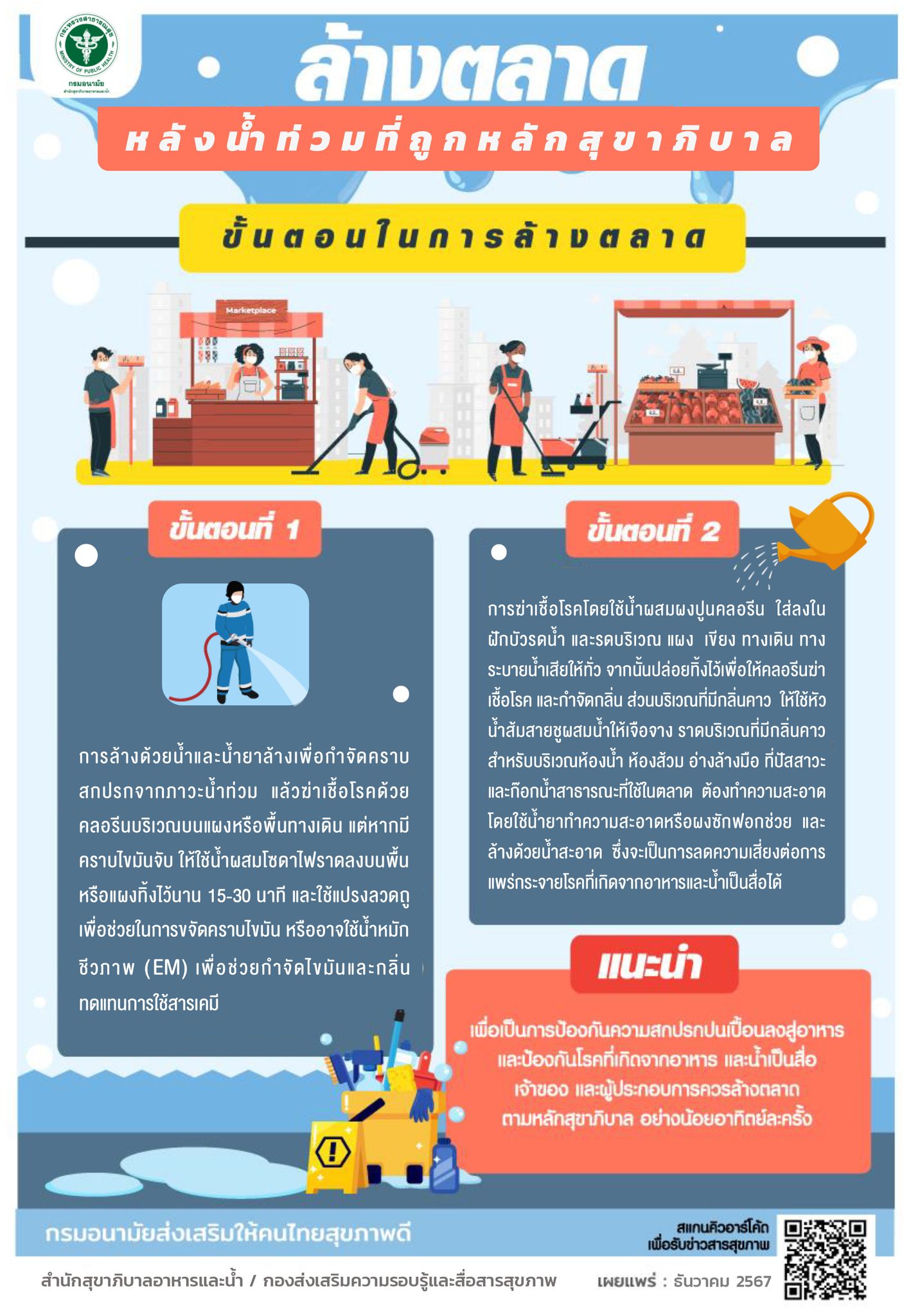 “กรมอนามัย กระทรวงสาธารณสุข ยังได้แนะนำการล้างทำความสะอาดสถานที่สาธารณะที่ต้องเปิดใช้งานโดยเร็ว อาทิ ตลาด โรงเรียน โดยขอให้สำรวจความเสียหาย ตรวจสอบโครงสร้าง และระบบไฟฟ้าให้ปลอดภัยก่อนเริ่มเข้าทำความสะอาด สำหรับ “ตลาด” จัดการสิ่งสกปรกบนเพดาน ฝาผนัง โคมไฟ และพัดลมก่อน จากนั้น กวาดเศษขยะตามพื้น ทางเดิน และรางระบายน้ำ ขัดคราบดินโคลน ไขมันบนพื้น ทางเดิน แผงจำหน่ายอาหาร และเขียงด้วยน้ำยาทำความสะอาดหรือโซดาไฟ แล้วล้างตามด้วยน้ำสะอาด ฆ่าเชื้อโรค ใช้น้ำยาฆ่าเชื้อโรค เช่น น้ำผสมผงปูนคลอรีน 60 เปอร์เซ็นต์ ในอัตราส่วน 1 ช้อนชาต่อน้ำ 20 ลิตร ใช้ฝักบัวรดน้ำบริเวณที่ต้องการทำความสะอาด และปล่อยทิ้งไว้เพื่อให้คลอรีนออกฤทธิ์ฆ่าเชื้อโรค ล้างห้องน้ำในตลาด ทำความสะอาดอ่างล้างมือ ก๊อกน้ำ ที่ปัสสาวะ สายฉีดชำระ ที่รองนั่งส้วม พื้นห้องส้วมและกลอนประตู ด้วยน้ำยาทำความสะอาด เน้นจุดเสี่ยง เช่น และล้างด้วยน้ำสะอาด สำรวจและลอกท่อระบายน้ำ กำจัดสิ่งอุดตันหรือขยะเพื่อป้องกันน้ำท่วมขัง สำหรับ “โรงเรียน” ทำความสะอาดเช่นเดียวกัน เน้นโต๊ะ เก้าอี้ สนามเด็กเล่น ห้องน้ำ ห้องครัว โรงอาหาร ตู้น้ำดื่ม เครื่องกรองน้ำ ที่สำคัญ รอให้ระบบไฟฟ้าแห้งสนิทก่อนใช้งานเพื่อป้องกันไฟฟ้าลัดวงจร ทั้งนี้ เจ้าหน้าที่ทำความสะอาดให้เตรียมชุดป้องกันอันตรายส่วนบุคคล เช่น หน้ากากอนามัย ถุงมือยาง รองเท้ายาง และเตรียมวัสดุทำความสะอาด เช่น ถุงดำ น้ำยาฆ่าเชื้อ สารส้ม คลอรีนน้ำ” อธิบดีกรมอนามัย กล่าว