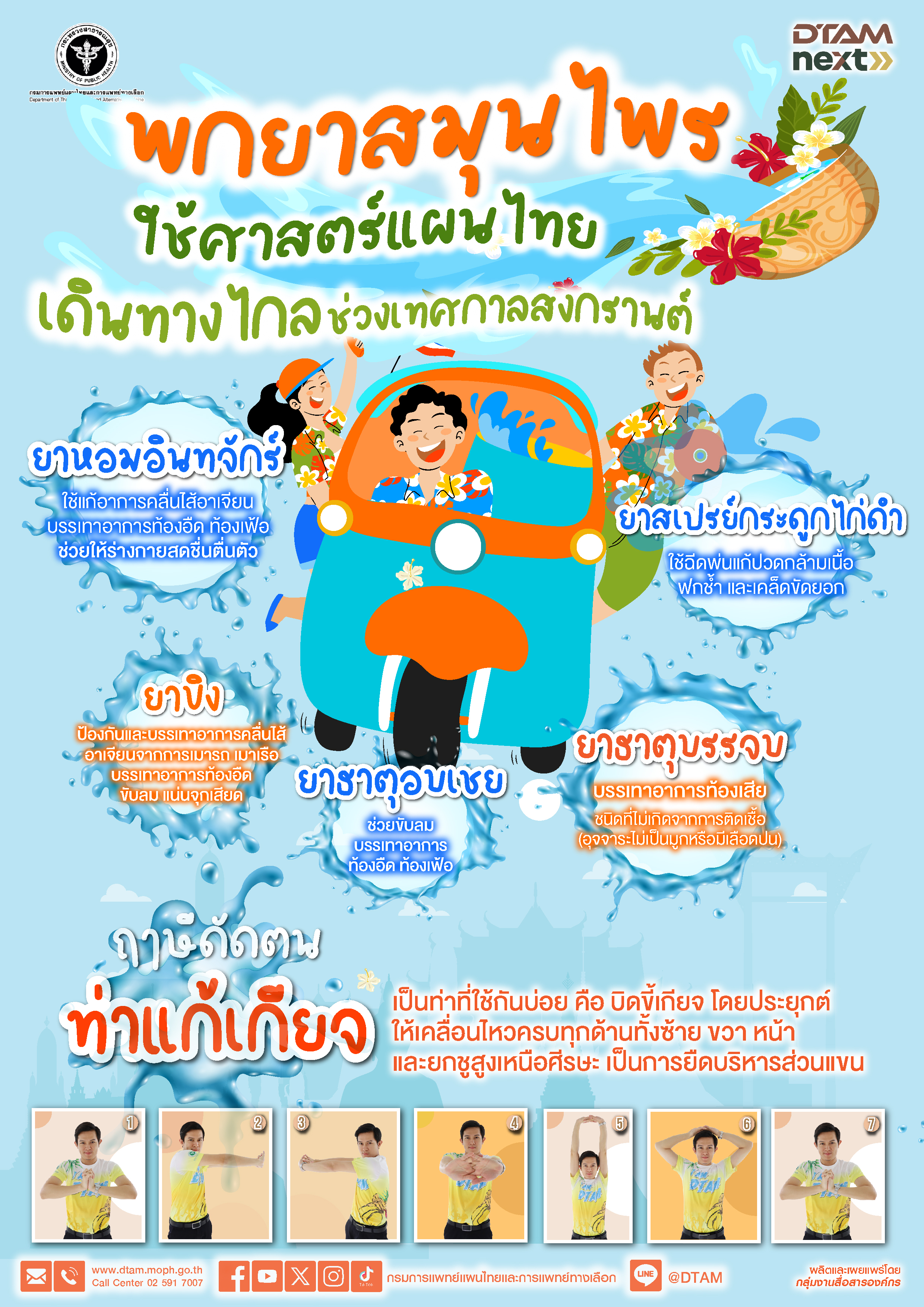 ประชาชนควรศึกษาฉลาก วิธีใช้ และข้อควรระวังของสมุนไพรก่อนใช้งานอย่างเคร่งครัด หากมีข้อสงสัยสามารถปรึกษาแพทย์แผนไทยได้ที่สถานบริการสาธารณสุขทั่วประเทศ หรือติดต่อสายด่วนกรมการแพทย์แผนไทยฯ โทร. 0 2149 5678 รวมถึงช่องทางออนไลน์ผ่าน Facebook และ Line @DTAM เพื่อการเดินทางที่ปลอดภัยและมีสุขภาพดีตลอดเทศกาลสงกรานต์นี้