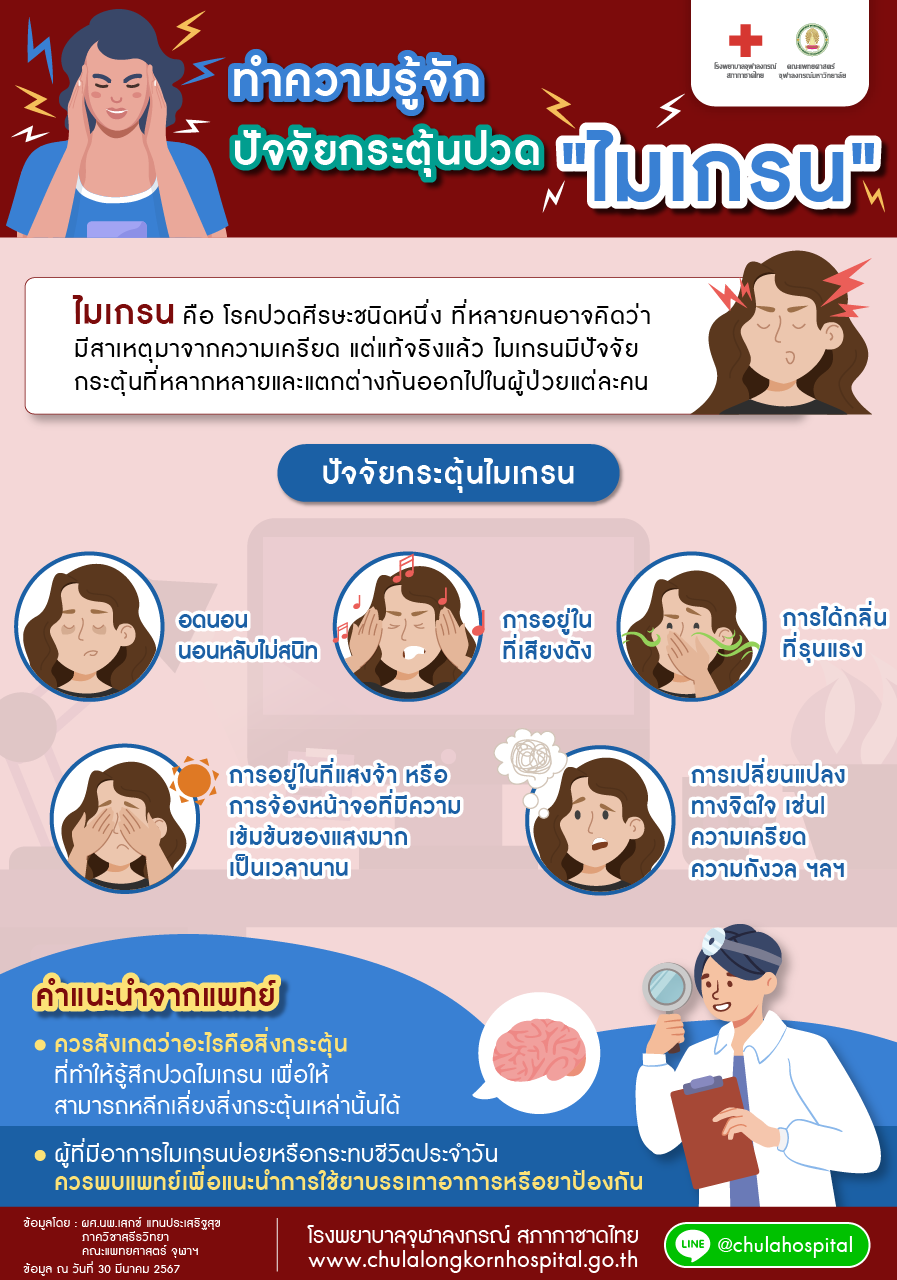 ไมเกรน คือ โรคปวดศีรษะชนิดหนึ่ง ที่หลายคนอาจคิดว่ามีสาเหตุมาจากความเครียด แต่แท้จริงแล้ว ไมเกรนมีปัจจัยกระตุ้นที่หลากหลายและแตกต่างกันออกไปในผู้ป่วยแต่ละคน