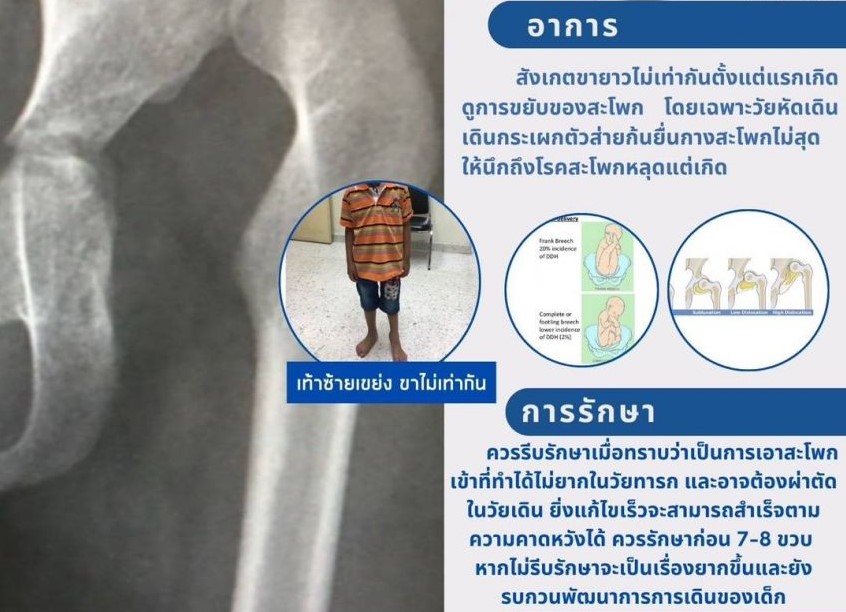 โรคข้อสะโพกหลุดแต่กำเนิด อาจเกิดขึ้นโดยไม่รู้ตัว ในเด็กทารกซึ่งยังเดินไม่ได้มักดูได้ยาก อาการจะแสดงชัดขึ้นเมื่อเด็กเข้าวัยเดิน โดยเฉพาะถ้ามีประวัติว่าคลอดท่าก้น พ่อแม่ควรสังเกตความเท่ากันของขา การขยับที่ดูน้อยผิดปกติ และถ้าลูกเข้าสู่วัยเดินได้แล้วแต่ท่าเดินผิดปกติ การเดินกระเผกตัวส่าย หรือนั่งขัดสมาธิไม่ได้ กาขาได้ไม่สุด ก้นยื่นหลังแอ่น ถ้าสงสัยควรนำเด็กมาพบแพทย์ผู้เชี่ยวชาญตรวจ เพราะหากปล่อยไว้นานสะโพกนั้นอาจเสียหาย ส่งผลให้เดินลำบากและเจ็บปวดในอนาคต