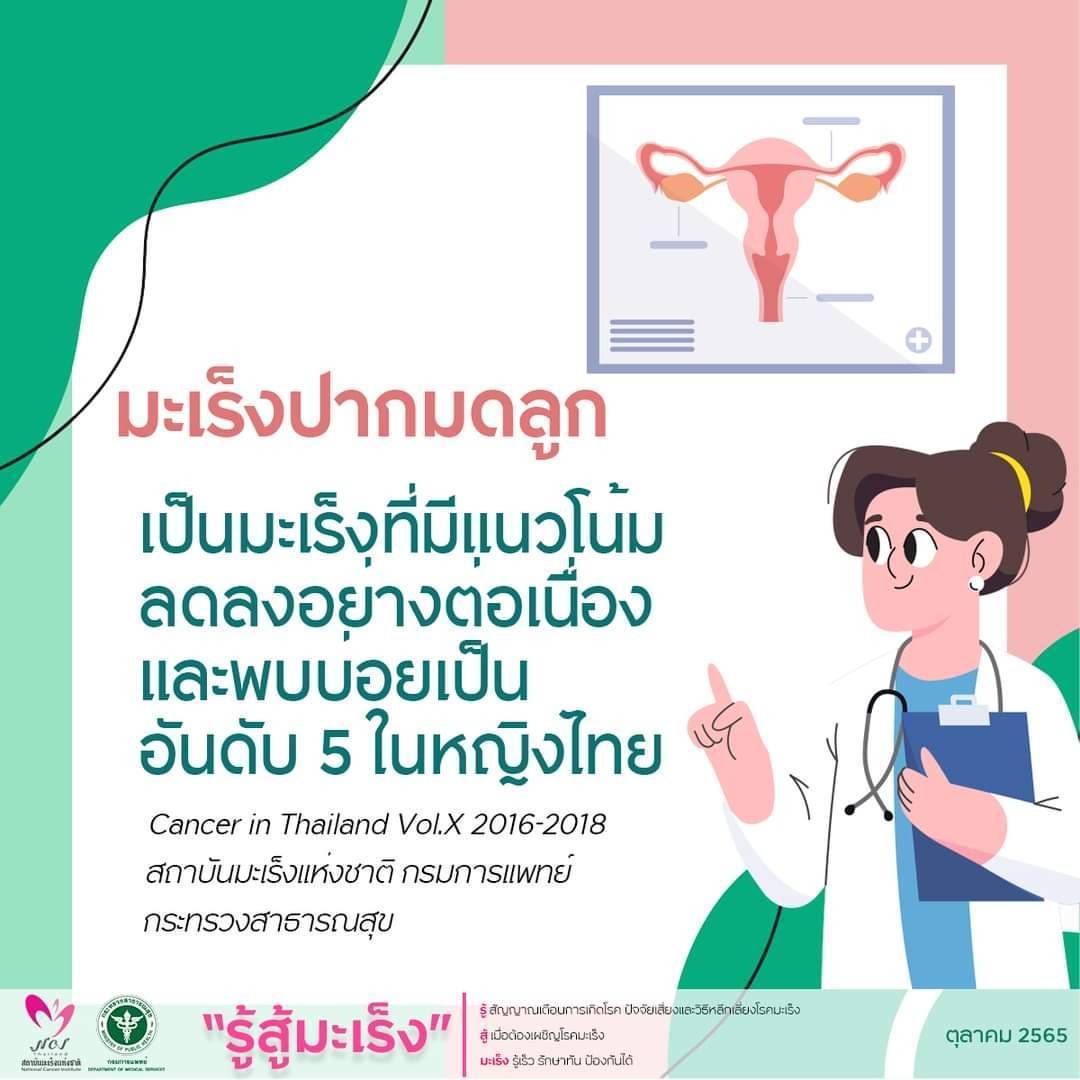 มะเร็งปากมดลูกเป็นหนึ่งในมะเร็งที่เราสามารถป้องกันได้จากการปฏิบัติตนเพื่อลดความเสี่ยงของการเกิดโรค รวมถึงการเข้ารับการตรวจคัดกรอง ซึ่งหากตรวจพบโรคในระยะเริ่มแรกจะทำให้การรักษาได้ผลดีมีโอกาสหายขาดจากโรคได้ ท่านสามารถติดตามความรู้ข่าวสารด้านโรคมะเร็งจากสถาบันมะเร็งแห่งชาติเพิ่มเติมได้ที่เว็บไซต์ส่งเสริมความรอบรู้สู้ภัยมะเร็ง http://allaboutcancer.nci.go.th/ เว็บไซต์ต่อต้านข่าวปลอมโรคมะเร็ง https://thaicancernews.nci.go.th/_v2/ และ Line : NCIรู้สู้มะเร็ง