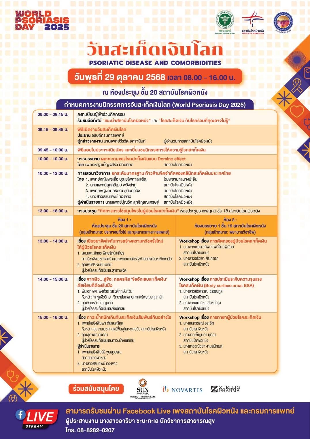 รายละเอียดงาน วันพุธที่ 29 ตุลาคม 2568 เวลา: 08.00 - 16.00 น. สถานที่: ห้องประชุม ชั้น 20 อาคารสถาบันโรคผิวหนัง ถนนราชวิถี กรุงเทพมหานคร ค่าใช้จ่าย ฟรีตลอดงาน